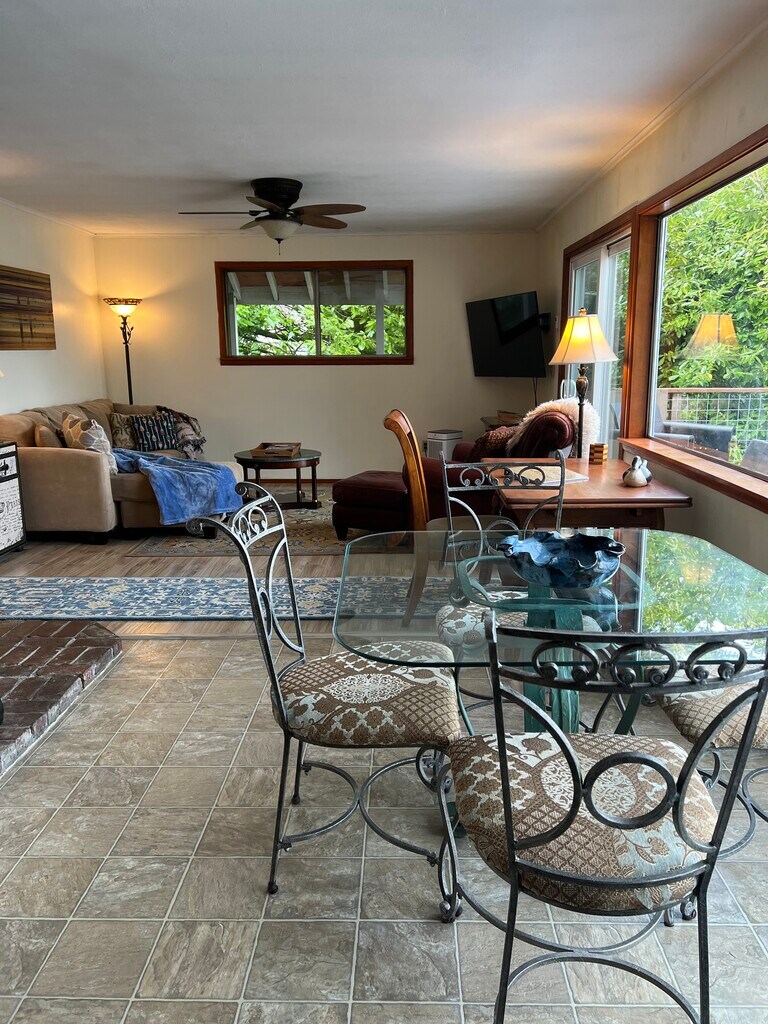 WATERFRONT HOME-FURNISHED-Gig Harbor-2 Bedroom, Home Office, 1 Bath-Top Floor of Two Story Home. Amazing sunsets and views from the furnished private patio that runs the entire front of the kitchen/living area. Enjoy your dedicated home office with garden view. Stroll the unique tropical gardens as you wind down rock paths to great kayaking from the no bank sandspit/beach below. Outside dining table/chairs with covered gas BBQ enhances your stay. A cozy stand-alone gas fireplace warms the living room. The home was originally built with 2 separate floors with only outside entrances. Parking for one car is available in the carport along with an electric car charging plug in (minimal fee for electricity used). One adjacent guest parking space is provided. The house is located on a private one lane quiet road. Enjoy the beauty of the one and half acres without the maintenance and yard work as we take care of the grounds. Highway 16 and downtown Gig Harbor are minutes away. All Utilities. Streaming, Landscaping charge $300 per month. 12 Month Leases. No Pets. No Smoking