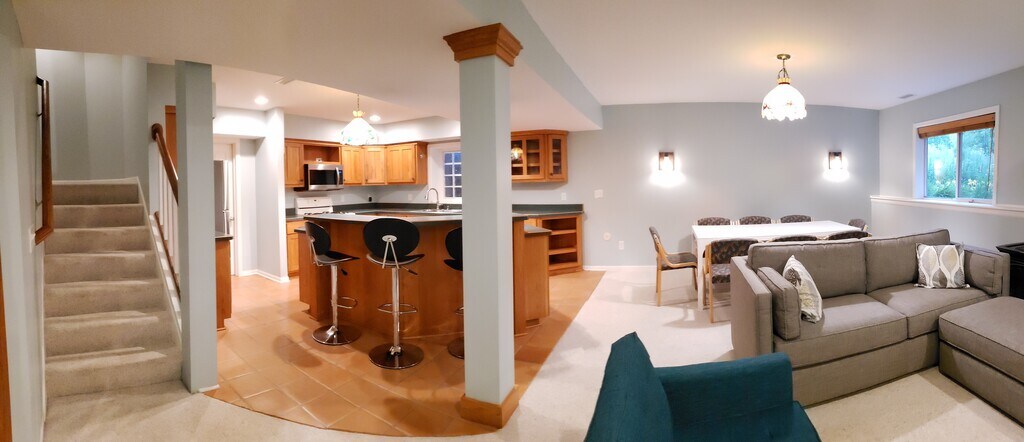 Mother-in-law unit with two bedroom, two bathroom, living room and dining room, and large walk-in closet in bedroom. Includes one attached garage stall. Full kitchen and direct access through the garage, on quiet cul-de-sac. Shared amenities: High-Speed Internet, Large backyard that includes a firepit area and tetherball. Great features - Minnetonka School district, close to downtown Chanhassen and Excelsior. Currently furnished with living room, dining room and bar stools. Can be removed if needed. No pets and non-smoking unit Credit report and background checks required for all adults in unit 1st Month rent, $700 deposit, and $250 cleaning fee due at lease signing.