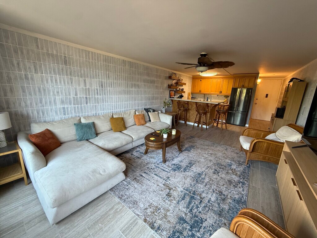 Freshly updated 1 Bedroom / 1 Bathroom furnished condo located steps from Aweoweo Beach Park on Oahu's North Shore. Enjoy an open concept living area with newly installed porcelain tile throughout the unit. The kitchen includes new quartz countertops, a large stainless steel sink, a dishwasher, and bar seating. The living room features ample space with a large sectional and vintage rattan lounge chairs, and also opens up to a 100 square foot Lanai with a great ocean breeze. The bedroom and bathroom were also recently updated with fresh tile and fixtures. Additionally, the unit features in-unit laundry. The lease includes a covered parking spot in the building's parking garage. Building amenities include an elevator, BBQ area, and rooftop views of the North Shore. The building also offers convenient access to biking and running trails. 12-Month Lease. Water/Sewer/HOA included. Tenet pays electric. No smoking. No pets preferred. First months rent and security deposit required at signing.