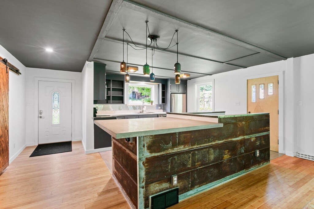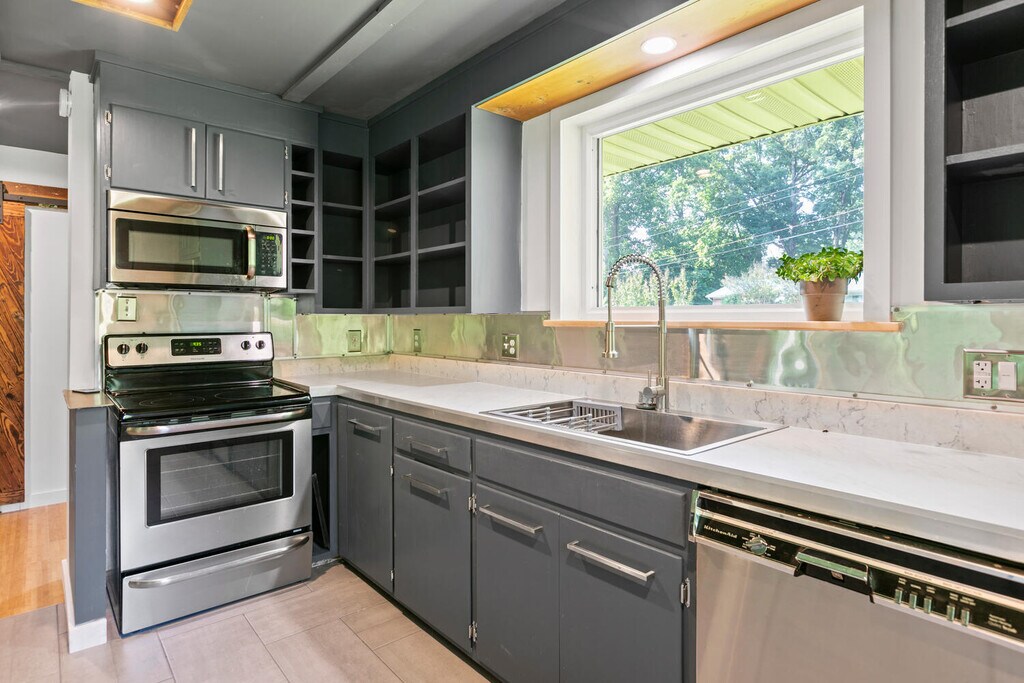 Beautifully reimagined modern home with an open-concept layout, ideally located in the heart of West Asheville. From the moment you step inside, expansive views of the nearly 1/3-acre lot create a sense of privacy and calm a true sanctuary just minutes from West Asheville's best coffee shops, microbreweries, restaurants, and wine bars. The main living space is anchored by a striking custom cement-countertop island, seamlessly connecting the kitchen and living room. Designed for both everyday living and entertaining, the space offers generous seating with a large sectional area and barstool seating at the island. The aesthetic is modern industrial, featuring hardwood floors, under-counter lighting, and thoughtfully crafted custom details using repurposed materials throughout. This 3,000-square-foot home includes 4 bedrooms and 2 bathrooms, resulting in above-average room sizes and large closets. In addition to the large laundry room, a standout feature is the newly finished 300-square-foot basement area, which can be used for additional storage, an additional great room, or dedicated office space. Whether you're hosting, working remotely, or relaxing, the home was intentionally redesigned to feel like your favorite lounge or coffee shop stylish, comfortable, and functional. Additional features include on-site laundry, off-street parking, ample outdoor space with a beautiful stone wall accent for added charm and privacy, plus a convenient outdoor storage shed for tools, bikes, or seasonal items.