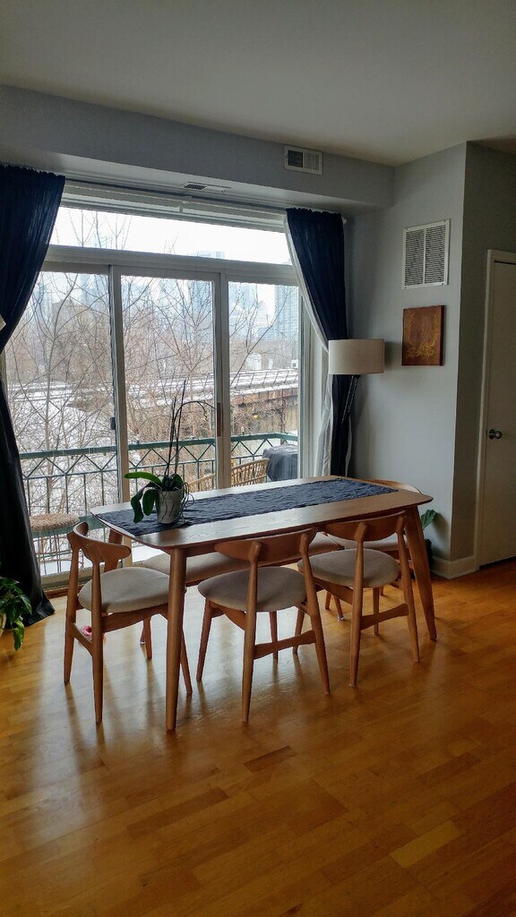 Corner 1 bedroom apartment with a private balcony and open view facing east and north. The property features: modern, open floor plan, big bedroom with an organized closet, hardwood floors, stainless steel appliances, window treatments, light fixtures, balcony, fireplace, washer and dryer in unit, central heat, AC and internet! Desirable location: walk to River North night clubs, Gold Coast shops, West Loop restaurants. Steps from the blue line. 6 story elevator building with an amazing rooftop deck and view of the downtown skyline. A great place to call home. Parking spot rents together with the unit for an additional $100.