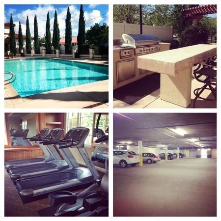 2x2 condo with large patio in a private interior courtyard. Stainless steel appliances, in-unit W/D, central AC. Hardwood floors in the living room, dining and kitchen, plush upgraded carpets in bedrooms. Walk in shower and separate oversized tub in master bathroom, with dual sinks and two walk-in closets. Also onsite 24 hour gym and heated pool and spa. Clubhouse to host events and BBQ area available as well. Several parks within steps of condo. 2 garage parking stalls come with the unit inside a gate. 10 minute walk to Great Mall and VTA/Bart. Utility fee of $175/per month on top of rent. Renter will setup their own electric account