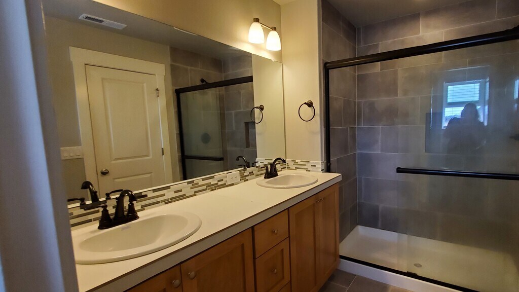 McCormick Creek in Ridgefield two-story, three bedroom, two and a half bath home built in 2022. Open room concept with a gas fireplace, LVP flooring on main level. Granite countertops in the kitchen plus pantry, and all stainless steel gas appliances. Tiled master shower covered deck and patio. Fenced. Central ACN Heating, two-car garage, sprinkler system. Laundry room upstairs washer and dryer included. High ceilings and all bedrooms have walk-in closets.