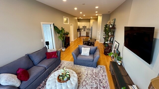 Hot River West neighborhood! This stunning two-bedroom condo boasts a spacious open floor plan and elegant hardwood floors throughout. The chef's kitchen is a standout feature, complete with newer white cabinets, modern matte black handles, stainless steel appliances, and quartz countertops. Both bedrooms are generously sized, and the full bathroom was recently remodeled with white quartz, shower bench & new tile. Additional conveniences include an in-unit washer/dryer and extra storage space. Abundant of rental parking options are available nearby, and you'll be just a few steps away from the Chicago Blue Line, the vibrant West Loop/Fulton Market, and more. Don't miss out on this exceptional opportunity! - Courtesy of Compass - Contact Jorge at Smart Home Realty