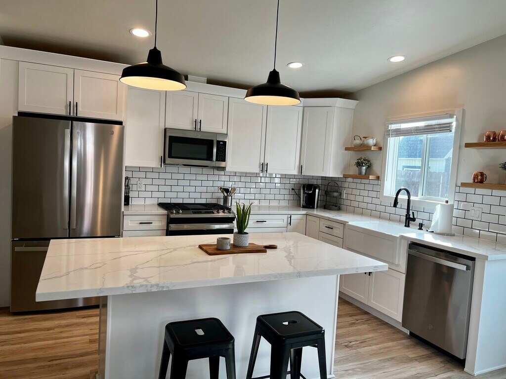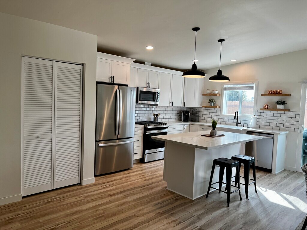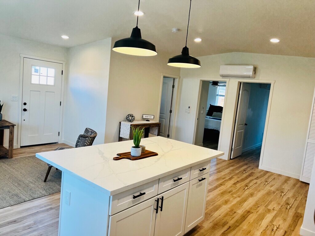 This new build, one mile from the beach, is a must see! Complete with beautiful kitchen including farm sink, gas range, microwave, fridge, dishwasher and over sized quartz island! Unit also includes, washer and dryer, ac mini split in all the rooms, beautiful new turfed private yard, and storage shed.