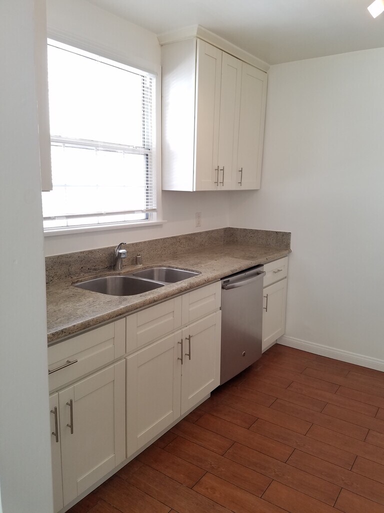 Charming first floor one bedroom, one bathroom apartments features updated kitchen with granite counters, stainless steel appliances (dishwasher, range, microwave and fridge) and plenty of cabinet storage. Dining area is open to large, light and bright living room. Remodeled bathroom has separate tub, spacious shower and vanity. Great location- walk to Ralph's, Target, TJ's and more. Water included in rent. Tenant pays for electricity and gas. One parking spot included on premises. Separate laundry room offers coin operated washer and dryer.