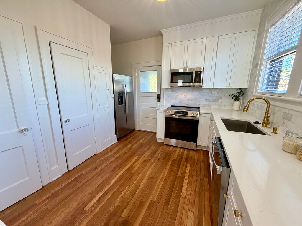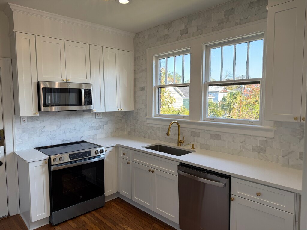 Step into historic charm blended with modern luxury in this fully remodeled upstairs unit of a duplex. This spacious 2-bedroom, 1-bath home features stunning hardwood floors throughout, a bright and airy layout, and thoughtful updates that elevate everyday living. Enjoy cooking in a stylish kitchen complete with marble backsplash to the ceiling, shaker cabinetry, and ample counter space. The unit also includes a dedicated laundry area for added convenience. Relax outdoors on your private balcony—perfect for morning coffee or unwinding after work. Fenced-in backyard. Located just 10 minutes from Downtown and 8 minutes from St. Joseph’s/Candler Hospital, this home offers unbeatable convenience while still nestled in a quiet, charming area. This unique home combines character, comfort, and an ideal location. Don’t miss the chance to make this beautifully refreshed historic unit your next home!