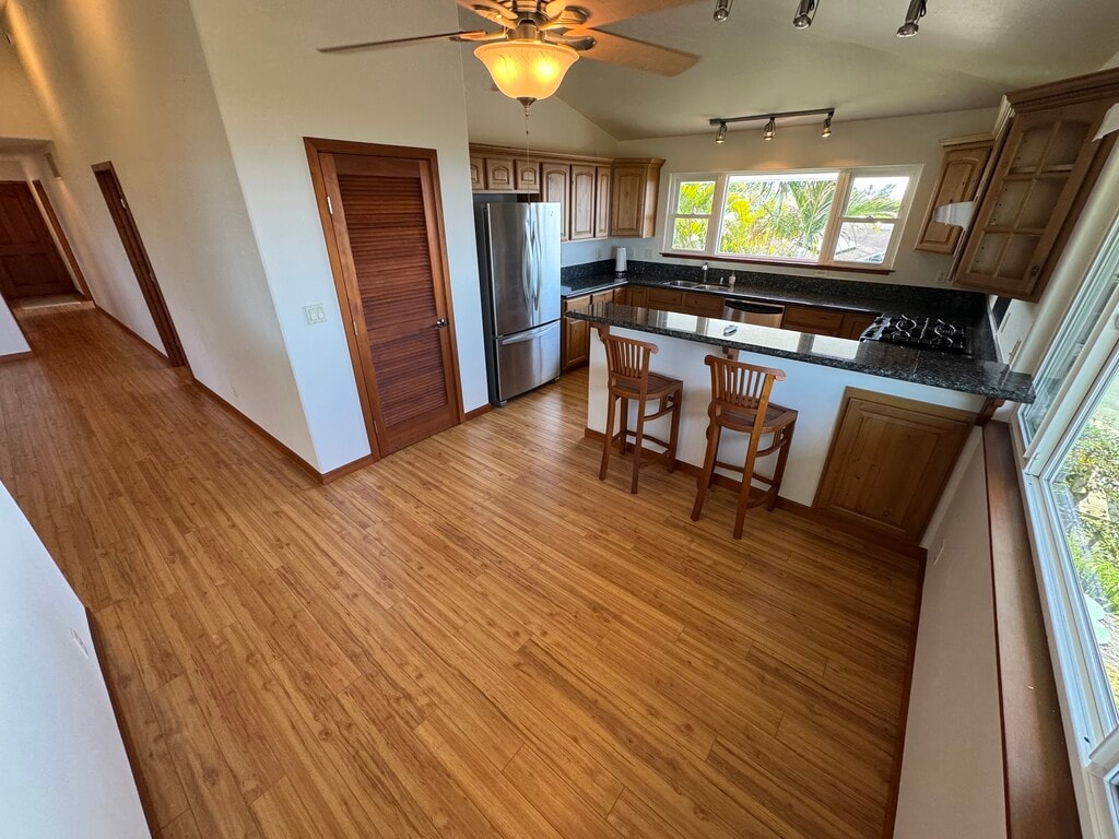 Stunning Ocean-View Home in Upper Kona Palisades Welcome home to one of Upper Kona Palisades’ most desirable locations, where sweeping ocean views, cool breezes, and breathtaking Kona sunsets define everyday living. This unfurnished 3-bedroom, 2-bath single-family home is nestled in Kalaoa Terrace, a quiet, private subdivision of well-maintained homes on a private road with a soon-to-be gated entrance. Property Highlights • Unobstructed ocean views from the covered lanai, living room and kitchen • Spacious covered lanai—perfect for sunset dinners and morning coffee • Cathedral ceilings enhance the open living and dining areas with light and airflow • Hardwood Floors • Large kitchen with abundant counter space, cabinetry, and a pass-through to the lanai • Brand-new Stainless-Steel Refrigerator • Split floor plan offering privacy for the primary suite • Jacuzzi Tub • Beautifully landscaped yard while offering excellent privacy • 2-car enclosed garage • Starlink high-speed Wi-Fi included • Utilities included (Electricity, Water, Gas) • Minutes from Kona International Airport • Cooler elevation and refreshing trade winds typical of Upper Kona Palisades Enjoy peaceful island living while remaining close to town, beaches, shopping, and dining. The elevated setting provides cooler temperatures and panoramic coastline views—ideal for those seeking both comfort and tranquility. Available January 15th 2026