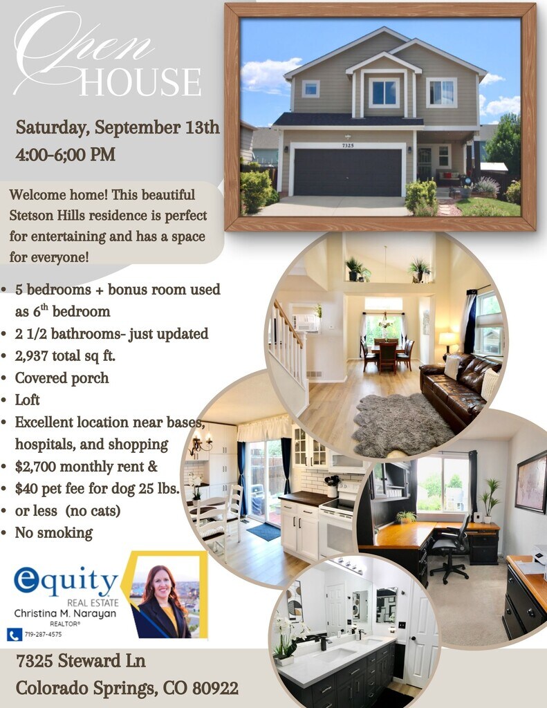 Beautiful 5-bedroom home with bonus room (currently used as a 6th bedroom) and loft! Curb appeal and a covered front porch welcome you home. Inside is a grand entry and vaulted ceilings in the bright and airy formal living and dining rooms. The updated kitchen features breakfast bars, a cozy eat-in area, and a full wall of newly added cabinetry, providing abundant storage. With two dining areas and two spacious living areas, this home is ideal for entertaining. The family room includes a stylish accent wall and flows seamlessly into the main living space. Youll also find a convenient half bath, laundry area, and 2-car garage access on the main floor. Gorgeous new LVP flooring throughout the main level and all bathrooms adds both warmth and durability. All three bathrooms have been updated with modern vanities for a fresh, cohesive look. Upstairs, a wide hallway leads to a versatile loft, four generous bedrooms, and two full baths. The primary suite boasts vaulted ceilings, a luxurious 5-piece bathroom, walk-in closet, and a flexible sitting areaperfect for a home office, nursery, or gym. The finished basement offers even more space: a large family room perfect for media or gaming, an oversized bedroom, and a bonus room. There is also a sizable unfinished storage area to keep you organized. Enjoy a fully fenced yard with mature evergreens offering year-round privacy, a red brick patio for gatherings, and a storage shed. Stay cool and efficient with an evaporative cooler, ideal for Colorado’s dry climate. Close to all military bases, hospitals, shopping, dining, and schools this move-in-ready home checks all the boxes, and best of all, no HOA! *No Smoking* *No cats* Prospective applicants can provide us with a portable screening report which MUST include credit report, criminal screening and rental screening. Schedule your showing today!