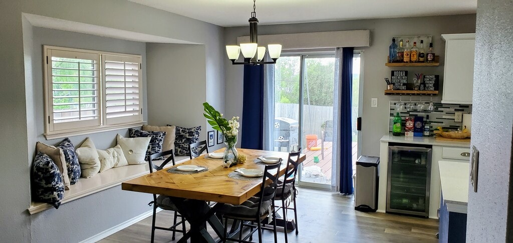 Charming and updated 3 Bed 2 Bath home in the North East of San Antonio. Super close to grocery stores, The Forum shopping center, IKEA, Live Oak shopping center, BAMC, Ft. Sam and Randolph Air Force Base. This home features an open floor plan with vinyl plank flooring throughout main areas of the home, marbled-like ceramic tiled floors in bathrooms and carpet in all bedrooms. Updated lighting throughout the home and quartz countertops in kitchen. Custom shelving with a beverage fridge in the kitchen and custom barn doors in the hallway and primary bedroom closet. Huge backyard with a beautiful hilltop view; literally the best place to watch sunsets and fireworks on the 4th of July and New Years Eve. All kitchen appliances included and there are washer/dryer connections located off the kitchen. This home is located towards the end of a cul-de-sac and the neighbors are awesome!