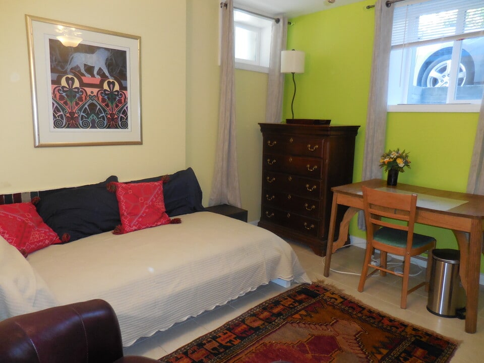Cozy furnished studio apartment in an impeccably maintained grand Queen Anne Victorian home (with a 2-room B&B). All utilities and WIFI included · Private entrance by a side door next to the yard with stairs to the 3rd floor. · Contains one large room with a separate kitchen area with refrigerator, sink, dishwasher, stove top, combination microwave and oven, and counter space. · Separate sitting area, a desk facing the windows, and a sleeping area with a queen bed, (air mattress for 1 guest must be reserved), · The 450 square feet · All utilities, Cable TV, HSI, window AC, linens and kitchen supplies provided. · Conveniently located, 1 block from Washington Square, with wonderful restaurants and shops, including our favorite European bakery and sandwich shop. · Subway just 15 minutes to downtown Boston, 10 minutes to Boston University and the Longwood Medical area, and 10 minutes to Boston College in the opposite direction. · PS: Your hosts speak French, Spanish, Danish, Russian, and Polish. 1 block to Beacon St subway green C line. 5 blocks to Commonwealth Ave subway to BU or BC. Bus #65 to Longwood Medical area at Washington and Bartlet.