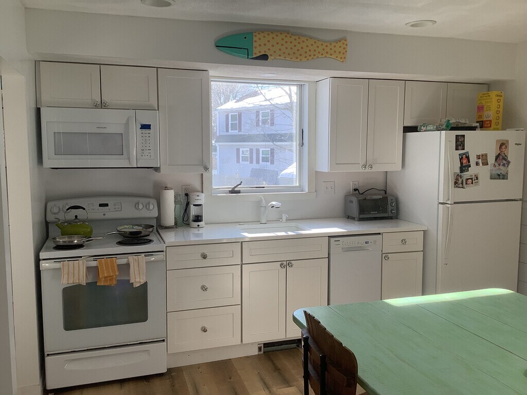 Recently renovated, sunny 1 br apt 1st floor unit of East Gloucester multi-family Furnished or unfurnished 4 rooms total Bright LR Charming kitchen with built-in hutch Office Bright bedroom with 10’ long closet Tiled bathroom Utility room with washer/dryer and storage Inviting furnished porch Prefer one individual only 1 off-street parking space $2,200 plus utilities