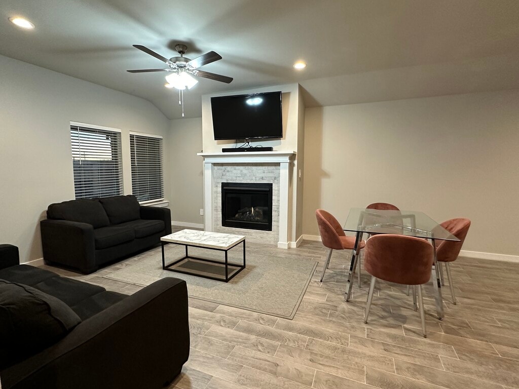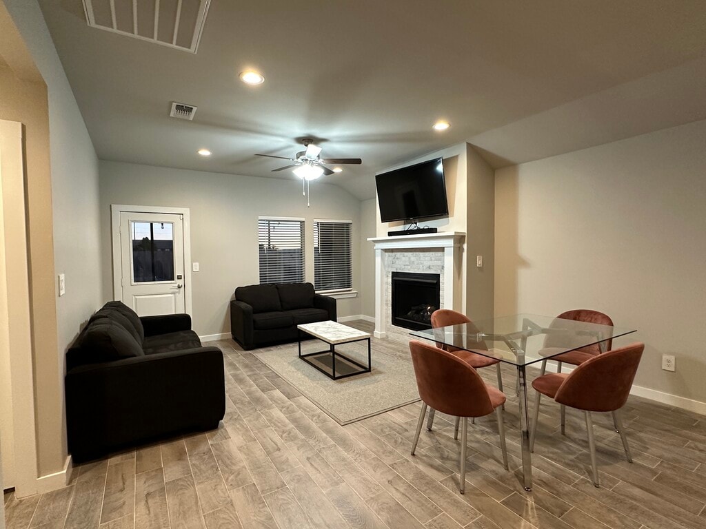 Built in 2023, this fully furnished 3 bedroom/2 bathroom property located in one of Lubbock's few gated communities. This community requires a code upon entry so you can ensure this neighborhood is safe & quiet. It comes fully furnished with exactly what is shown in the pictures. In unit washer & dryer, refrigerator, a 2 car garage, a driveway, back and front yard, private trash bins, and a gas fireplace. This property does have a Vivint security system installed but will be at renters expense if renter decides to activate. Only a 9 minute drive to LCU, 10 minute drive to UMC, & 13 minute drive to Texas Tech! 1 pet is allowed ($200 per fee.) Rental term is a 6 month minimum per lease agreement. $59 application fee per adult.