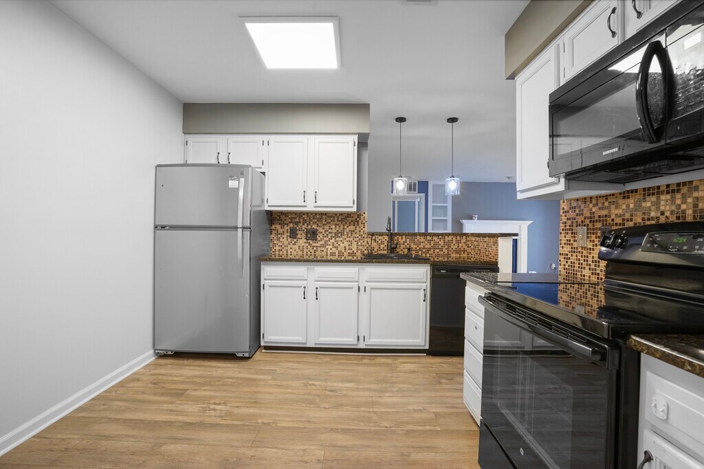 Experience this spacious, light-filled 1,248 sq ft 2-bedroom, 2-bath condo featuring the desirable Newcastle floor plan, located in the Stratford Place community of Kingstowne in Alexandria. With extensive upgrades throughout, this home is truly move-in ready. The unit features hard flooring throughout, new energy-efficient windows, a new furnace and A/C (2019), a hot water heater (2023), and fully renovated bathrooms. Additional highlights include recessed lighting and fresh paint. Enjoy the sunny, open floor plan with a real wood-burning fireplace and direct access to a ~100 sq ft private outdoor deck overlooking trees. The spacious primary bedroom includes an en-suite bath with a custom shower and custom walk-in closets. The second bedroom features built-in bookshelves, ideal for a home office or guest room. The smart layout offers privacy, with two separated bedrooms and the living room and kitchen positioned between them. Set in a quiet, private location backing to trees, the community offers excellent amenities including a pool, fitness center, tennis courts, and walking trails. Minutes from the Springfield Metro, Fort Belvoir, and Kingstowne with abundant shopping and dining. Parking: Please use Space #17 or visitor parking when showing. In-person tours welcome by appointment.