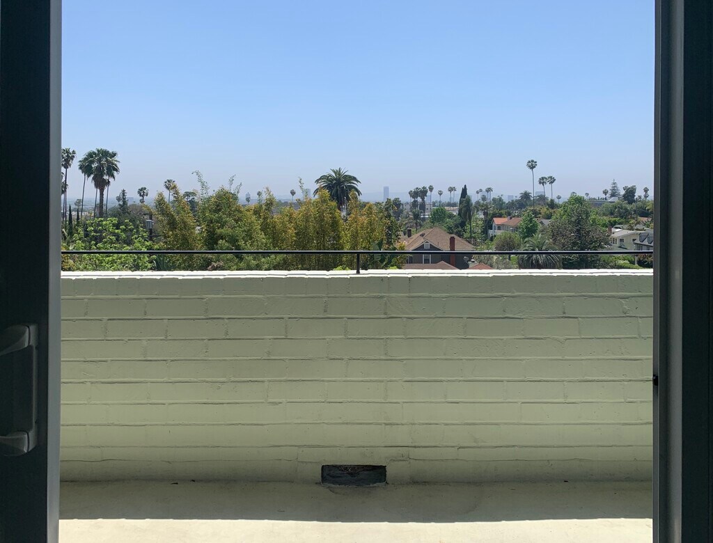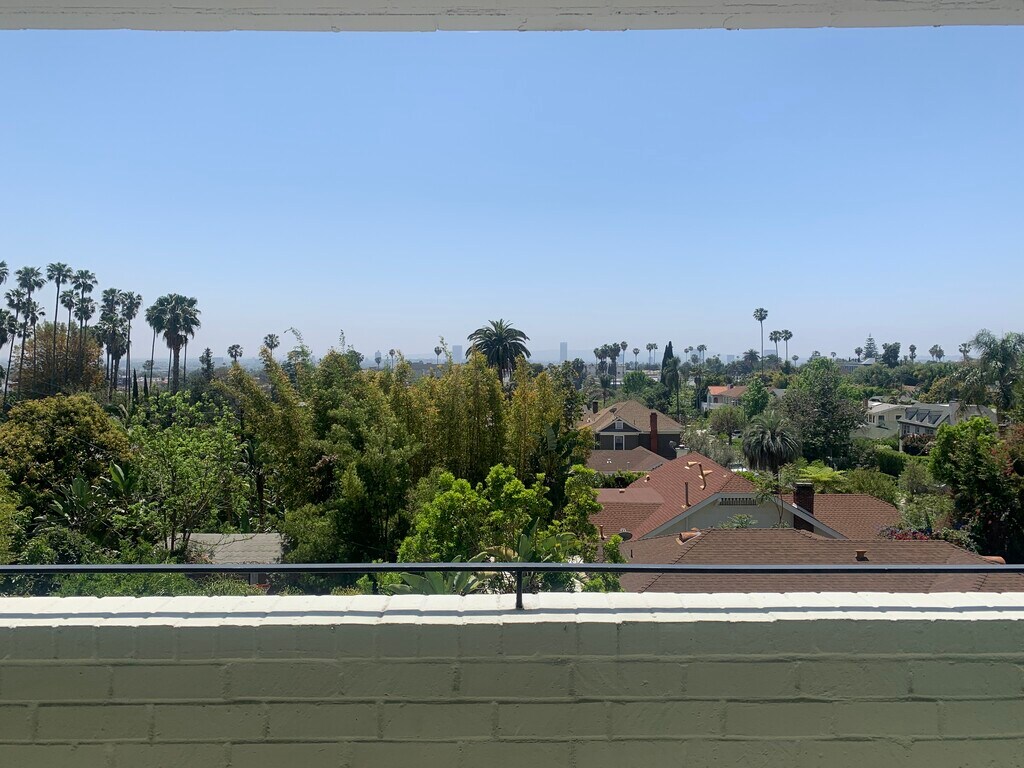 Spacious, rare find, and remodeled corner unit with stunning panoramic views on the best part of Hollywood Blvd! Over 1,400 sf with a single-story floor plan and recently undergone a complete custom renovation, including dramatic entrance foyer and crown molding throughout. This expansive unit is flooded with natural light, and the upper floor flat on the quiet back corner of the building features both southern and western exposures and large sliding glass doors that lead to its private balcony with beautiful unobstructed views of the city. Modern chef's kitchen boasts double oven, brand new appliances, Spanish floor tiles, and custom backsplash. One large bedroom plus Den/Office that could be used as a guest bedroom, and ample closet and storage space (5 closets!). Both bedroom and Den share no walls and feature western views. Designer done spacious master bathroom with double vanity and features dual showers. Additional guest "powder room bathroom" off of the foyer (1.25 bathrooms total). Carpet and marble floors, new triple-pane windows keep unit cool or warm, recessed lights, and wall-unit AC. The building has a large salt water pool and patio area, perfect for family and friends. One parking space. Laundry is community, located on the same floor. The building is seated in historic Spaulding Square on palm-lined streets, walking distance to Runyon Canyon, Wattles Garden Park, and less than 1 mile from world famous La Brea Blvd, Sunset Blvd, and Fairfax Ave for shops, markets, restaurants, and entertainment. A very special living space in an excellent central location, convenient to Laurel Canyon and the 101 freeway.