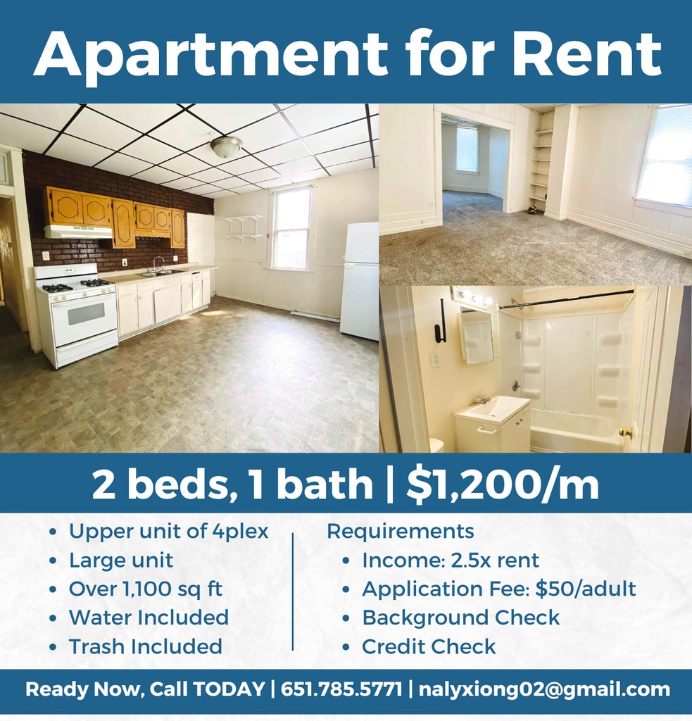 - $1,200 per month - 2.5x rent income requirement - Background and credit check - $50 application fee per adult - Spacious, over 1,100 sq ft - Upper unit of 4plex - Water and trash included