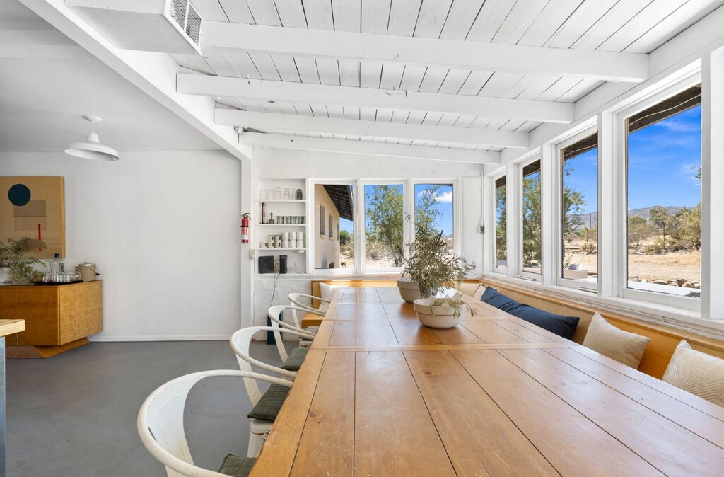The wide open, right outside Joshua Tree. Mid-century modern on 3.14 acres. Five lots, fully fenced, two fireplaces, polished concrete floors, and windows that make the desert the whole point. Three bedrooms, two bathrooms, 2,100+ square feet of clean-lined space that actually breathes. Outside: Mature olive trees, citrus, a firepit patio, built-in BBQ, mountain views, and sunsets that earn it. Five minutes to the park entrance. Five minutes to downtown. World-class hiking, climbing, and the darkest skies in Southern California — all of it at the door. This is not a generic desert rental. 3 bed · 2 bath · 2,100+ sq ft · 3.14 acres · Joshua Tree National Park adjacent