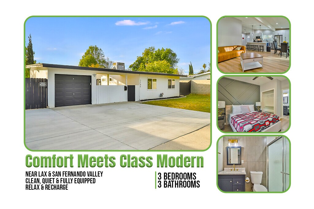 Fully Renovated Modern Home – Jacuzzi, Pool & Flexible Leasing Special Pricing For: Housing Specialists ALE Solutions Agents Sedgwick Property Highlights 3 Bedrooms | 3 Bathrooms | Spacious Master Suite w/ walk-in closet & luxury bath Fully Renovated: new appliances, central A/C & heating, dual-pane windows Open floor plan w/ oversized chef’s island & modern finishes Indoor/outdoor living inspired by the French countryside Jacuzzi + pool in a private, quiet Reseda neighborhood Large lot backing to open space – perfect for privacy & relaxation Furnishing Options Unfurnished / Semi-Furnished available Flexible lease terms Lifestyle & Location Minutes to The Mall, Costco, dining & shopping in San Fernando Valley 30 mins to Malibu & nearby beaches Close to hiking trails, entertainment, and attractions Pet-friendly property Perfect For Corporate housing Families & groups seeking a quiet getaway Guests looking for a modern resort-style experience