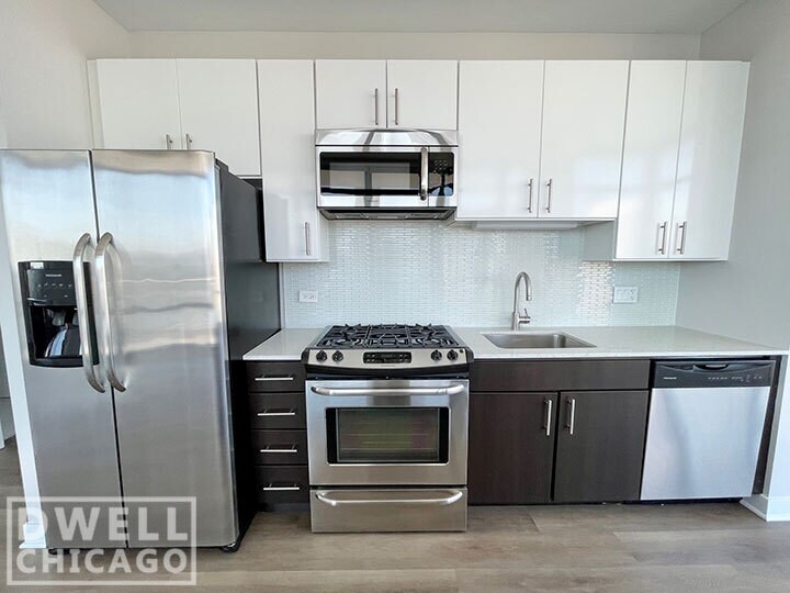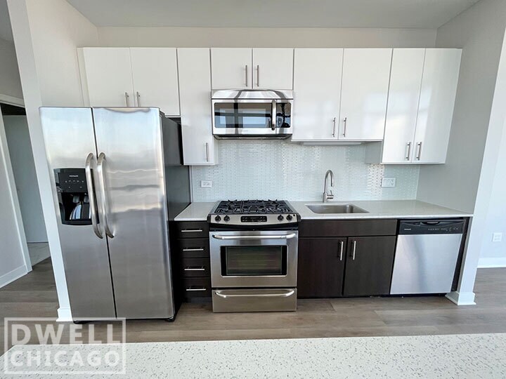 Easy expressway access and a straight shot to the Loop. For remote workers, a neighborhood feel just outside downtown. Half-acre rooftop deck with pool, grills, fire pit, and outdoor yoga space. Inside: fitness center, lounge, game room, and coffee bar. 24-hour door staff and smoke-free throughout. Units feature quartz countertops, soft-close cabinetry, gas stoves, wide-plank flooring, in-unit laundry, and walk-in closets. Select layouts add floor-to-ceiling windows and balconies. Garage parking available. Cats and dogs welcome (breed restrictions, no weight limit). Photos may be of a similar unit (same tier, different floor). Pricing varies by move-in date and lease term.