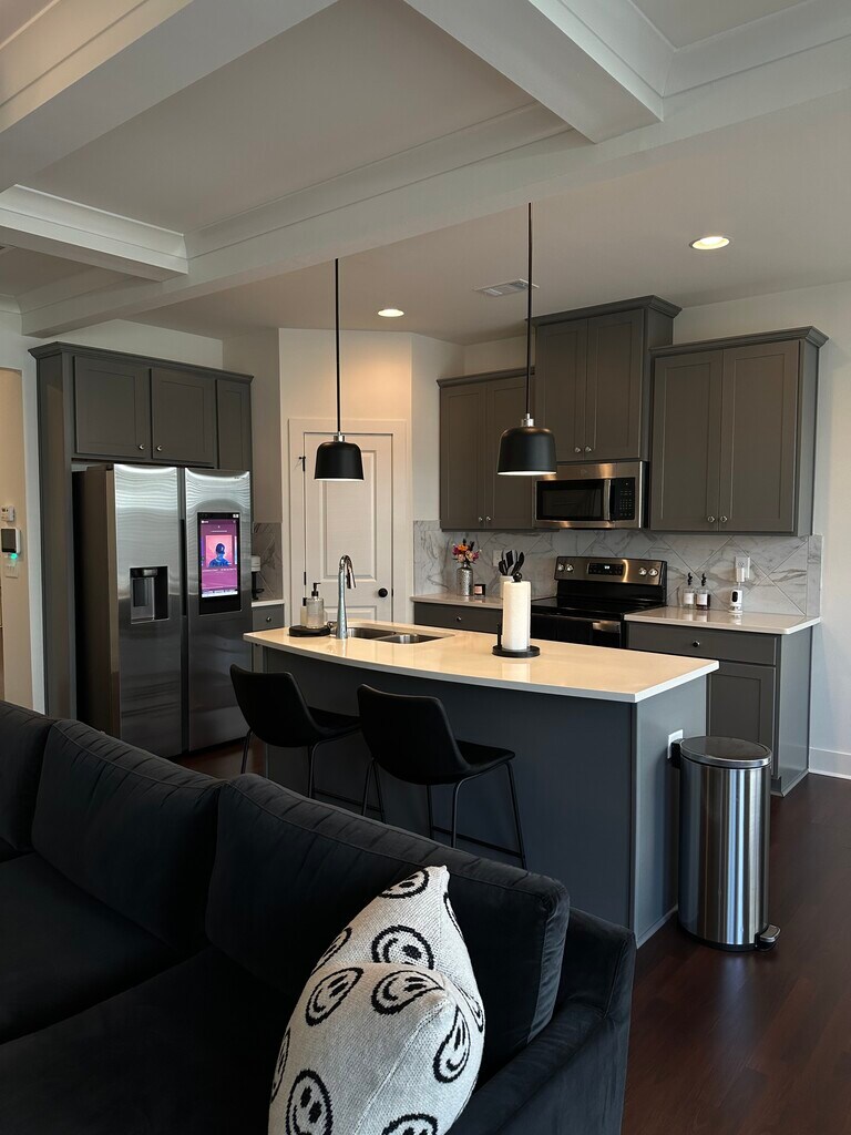 Showings by appointment only. Experience the luxury and comfort in this sophisticated townhome community. This home has three spacious bedrooms and 2.5 baths. Step into the gourmet kitchen that features granite countertops, stainless steel appliances, and a functional kitchen island. The kitchen features 42-inch cabinets with a beautifully tiled backsplash. The Primary Suite offers an oversized master bedroom with tons of space for a full sitting area. Enjoy the en-suite bathroom, complete with a soaking tub, a glass-enclosed shower, dual vanities, and beautiful tile flooring. This new Rocklyn home (built in 2023) offers beautiful coffered ceilings and hardwood flooring throughout the main level. For those who want privacy, the property is enclosed by a privacy fence, ensuring peaceful outdoor moments. Located in the heart of Fairburn, Renaissance at South Park offers convenience, including on-site security, a clubhouse, tennis court, and pool. Less that 2 miles away, you'll find Piedmont Urgent Care, Starbucks, Dunkin Donuts, Chipotle, Cracker Barrel, OZ Pizza, and so many more restaurants to satisfy your cravings. With swift access to I-85 and Hartsfield Jackson International Airport, you're never far from the lively city of Atlanta. With Downtown Atlanta being less than 30 minutes away, everything is within reach. Renter pays for all utilities. Owner provides lawn maintenance. Home will come unfurnished with all appliances. The washer and dryer will be included. No pets allowed. There will be a standard stainless steel Samsung side-by-side refrigerator in the home. It will not include the screen, as pictured.