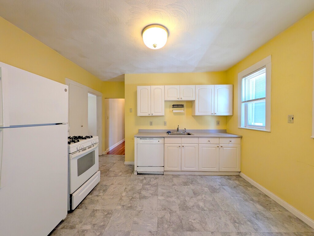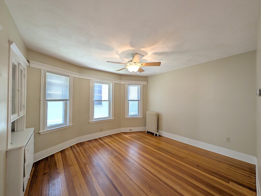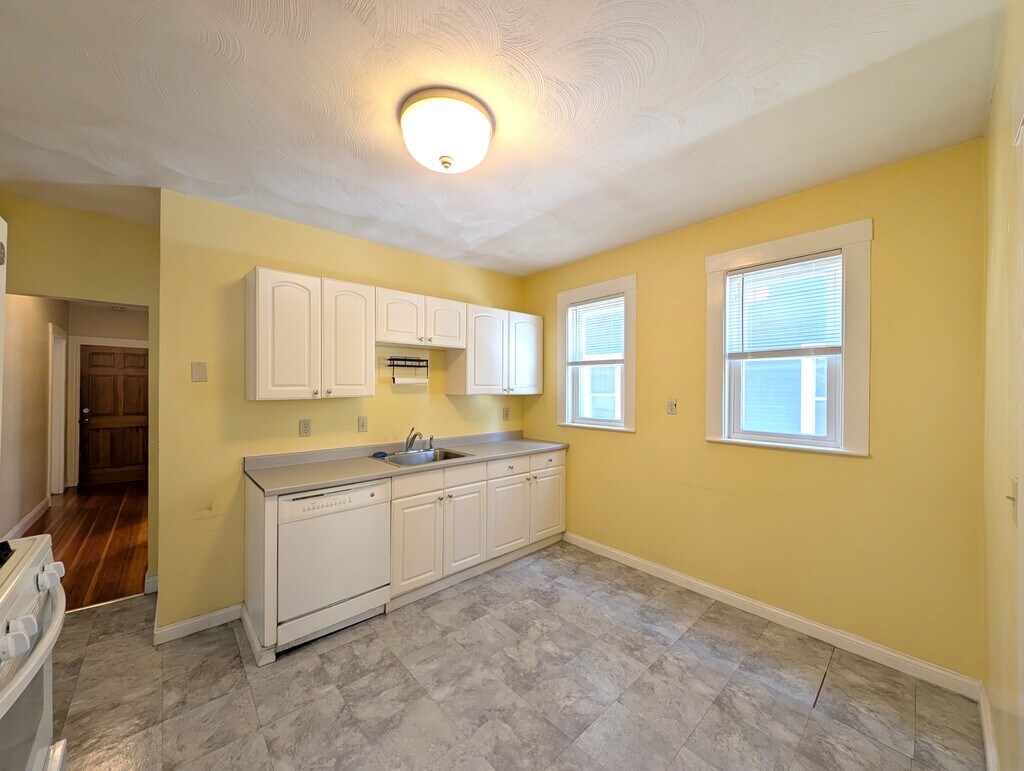 First floor unit in a 3 unit house. Hardwood floors throughout. Eat-in kitchen with refrigerator, stove, dishwasher, pantry storage, and room for a dining table. Sunny living room with bay window and built-in storage. Each of the three bedrooms has a closet. Tile bathroom. Storage and laundry available in the basement. Back porch just for this unit as well as a shared yard. Off street parking available. One cat negotiable. Available immediately OR June 1, 2026.