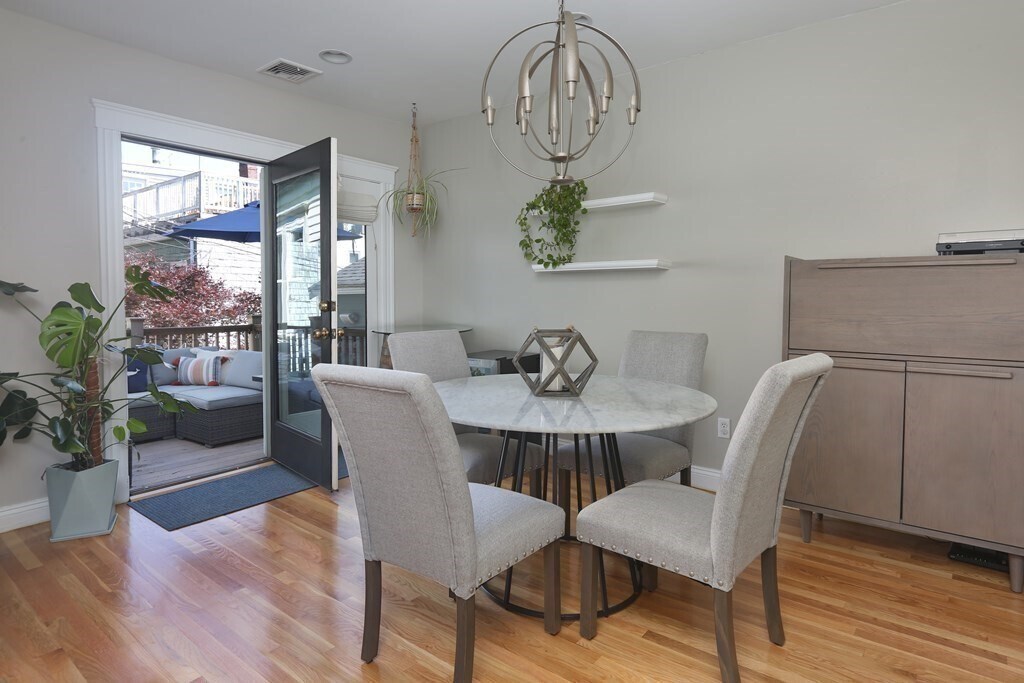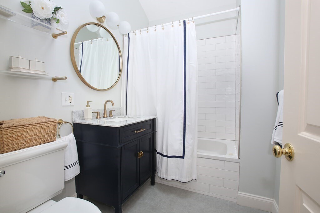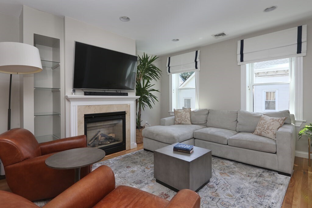 This renovated 2 bedroom, 2 full-bath + office in an ideal location, close proximity to Monument Square, Charlestown shops, restaurants and public transportation, offers a sun-filled eat in kitchen with stainless appliances including gas range, quartz counters and subway tile backsplash. The spacious dining fits a large table and offers glass doors to a serene private deck. The inviting living boasts wood floors and gas fireplace w/custom built-in. A bonus room sits off of living and makes an ideal office/den/nursery. A full bath with shower is found on this floor. Upstairs are 2 spacious bedrooms, each with two skylights w/abundant light, custom closets, & renovated bath w/navy vanity and tub/shower surround. Attic offers enormous storage space w/add. storage unit in basement. Cent. air & in-unit washer/dryer b In addition to street permit parking is the school lot located across street, which is available on evenings &weekends. 73130 810