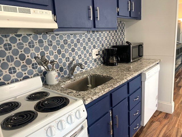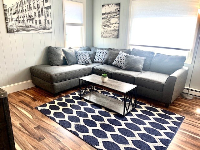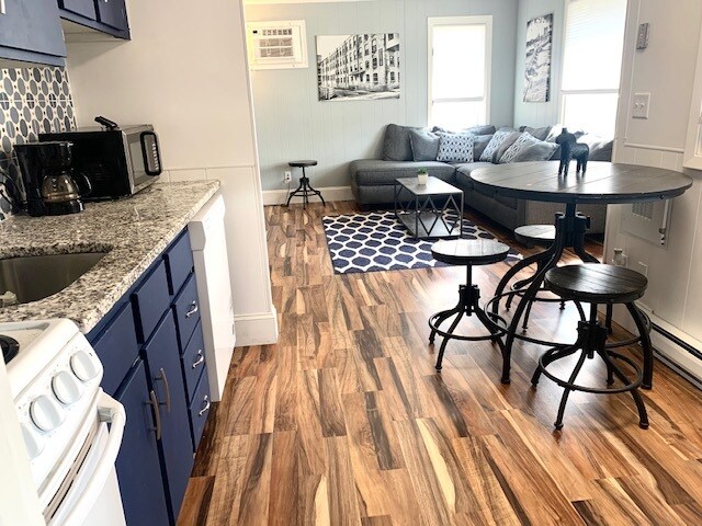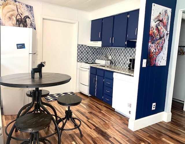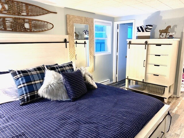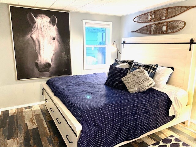 The Blue Horse is a personal favorite at Ritchie Village. Some upgrades include granite countertops and granite vanity, an in unit laundry, fireplace, 65? Roku Smart TV, new refrigerator, and a fun bright color navy blue horse-themed decor. New furniture including the distressed king bedroom set with built in lighting and USB ports, combined with side table and gentlemen’s chest are featured in this well laid out petite-sized suite. Clients have a dishwasher, stove, microwave, fully stocked kitchen, private garage entrance with remote and the privacy of a first floor duplex with no one upstairs or down.