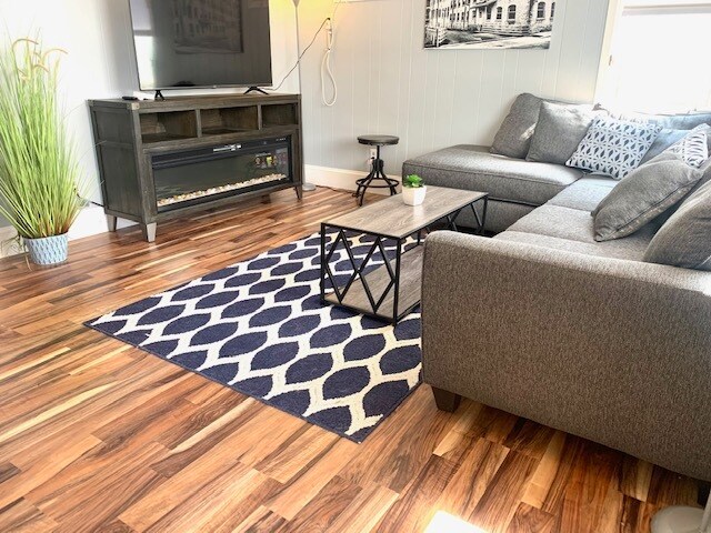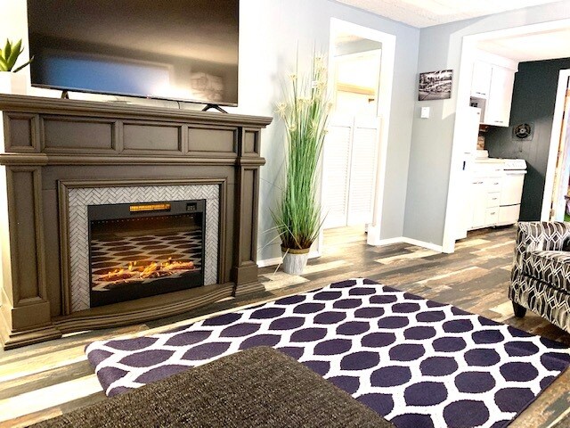 “The Ranch” at Ritchie Village. Unit 10 pictured here is a guest favorite. Great king-sized bed with under storage, pub table, saloon doors, electric fireplace with 65? TV, gentlemen’s chest and a signature horse oil painting makes this small space special with it’s horse ranch design theme. The addition of Ritchie Village to our portfolio of corporate housing options gives our travelers and individuals in transition a more budget friendly option to choose from, without sacrificing the modern updates and amenities our guests have grown to love. Ritchie Village is located in Appleton only blocks away from highway access and main shopping and business on Appleton’s west side also known as Grand Chute. Each of the 16 furnished units are half of ranch duplexes each with attached single car garages. The units are 560 square feet with a mini kitchen (this unit also has upgraded dishwasher and granite countertops) but all have an apartment sized stove and refrigerator, as well as a kitchen dining table and chairs. The living room includes sofa, end tables, new modern electric fireplace and large 50-65? new flat screen smart TVs. Upgrades also include new private in unit laundries, updated flooring and decor. Pictured here is Unit 10. We have 16 of these units all with varying design, with avails rotating in approximately every three weeks. Terms: $1875 per month base. $150 Cleaning Fee. $250 per pet fee. 30 day NTV $500 security. Based on three months or more length of stay and start date of September-May.