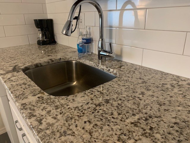 The Feeling Zen theme unfolded after the beautiful bamboo floors were installed. The warm color multi-shaded bamboo begged for a slightly different more earthy feel than some of our other units. Inspired furnishings and decor, light green walls and black and white local canvases come together for a Feeling of Zen at Unit 9 in Ritchie Village. Yes to private in unit laundry, full mini kitchen, private garage access, and we’ve upgraded the bed size to a king since these photos were captured. New white leather couch also just added and an entertainment package at this unit includes 65? Roku HiSense TV in the living room, a second 43? Roku HiSense TV in the bedroom and a cable and WiFi package. This unit’s bathroom has walk in shower and no tub, so it’s ideal for an individual trying to find a living arrangement with no steps. Additional recent updates include a full sized stove, dishwasher, large electric fireplace and custom tile kitchen table to match the new tile backsplash.