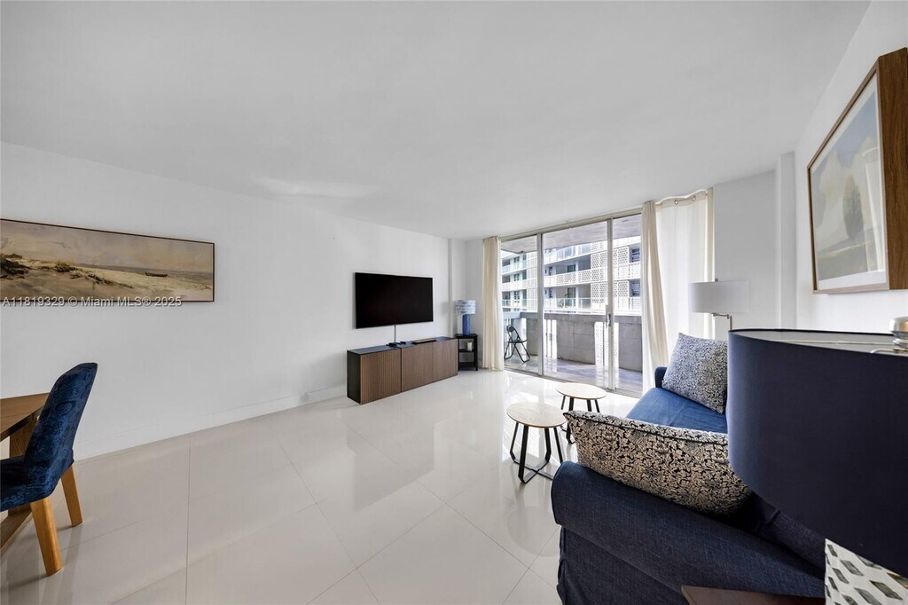 This 1-bedroom, 1-bathroom apartment at 800 West Ave offers 810 square feet of living space. The living room provides ample room for relaxation and features air conditioning for comfort. The kitchen includes a dishwasher for convenient meal preparation and cleanup. The bedroom is spacious, accommodating a queen-sized bed and additional furniture. The bathroom is equipped with standard fixtures. Additional amenities include an in-unit washer and dryer for laundry convenience. The exterior features a well-maintained building with easy access to nearby services. Brickell Brokers LLC Courtesy of Douglas Elliman