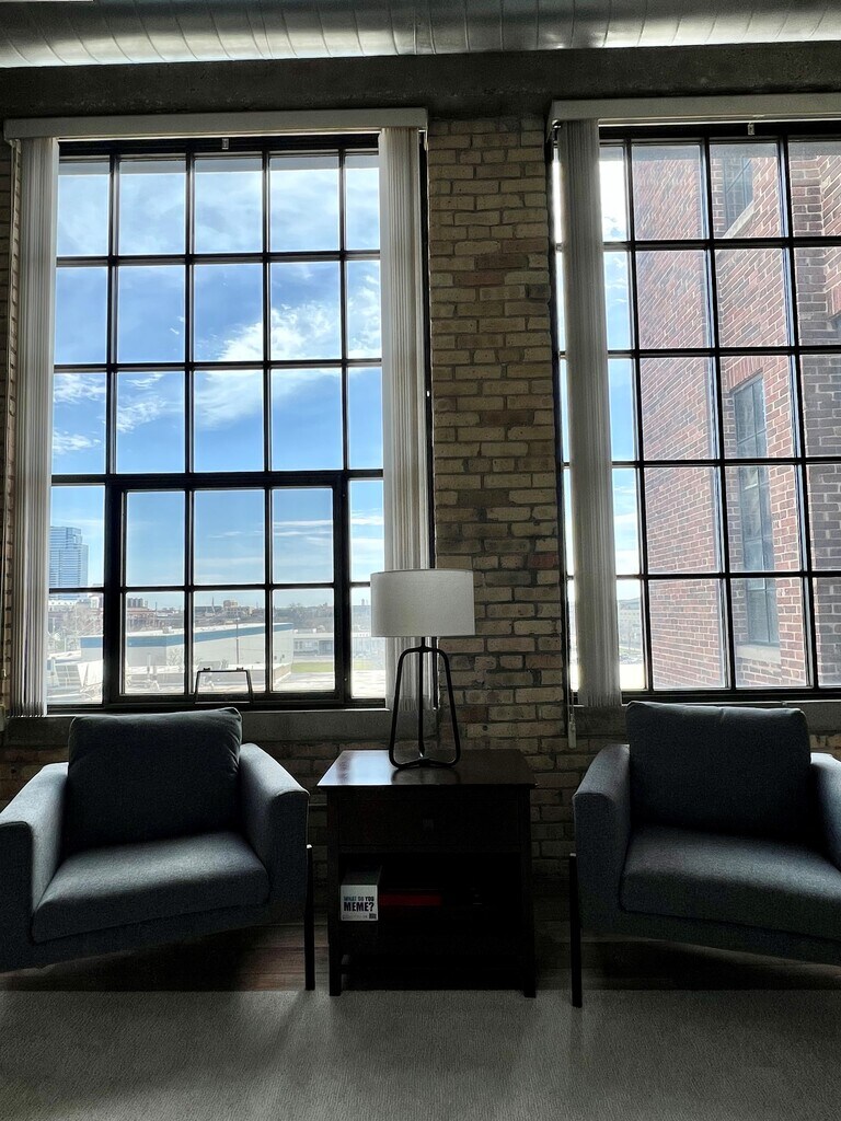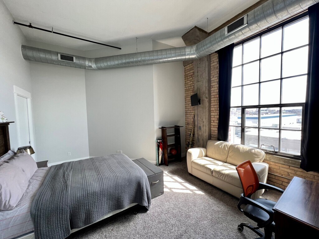 Spacious 1 bedroom condo with walk-in closet, tall ceilings, and a garage space included. Downtown Grand Rapids and walking distance to the fast growing West Side Bridge Street area. This condo is 1,225 square feet with 13 foot ceilings. Large, south-facing windows provide beautiful views of Grand Rapids and ample natural lighting. Exposed brick on exterior walls adds to the unique character (and makes for a fantastic work-from-home background). A balanced open concept allows connection between the kitchen, dining area, and living room. A large, recently remodeled bathroom offers duel sinks and a modern in-unit washer and dryer combination. Connecting the bathroom and bedroom is a massive walk-in closet. A large bedroom allows for plenty of space for a bed, desk, and more. Located on the 4th floor of the American Seating building, this unit is the only 1 bedroom condo of its kind. The building is quiet with concrete floors and strong walls (only 1 is shared), allowing residences to feel completely apart from their neighbors. Also included is a 1 car garage that can be used for parking or storage. Additional parking is never an issue, given the massive (200+ spaces) parking lot at the front of the building.