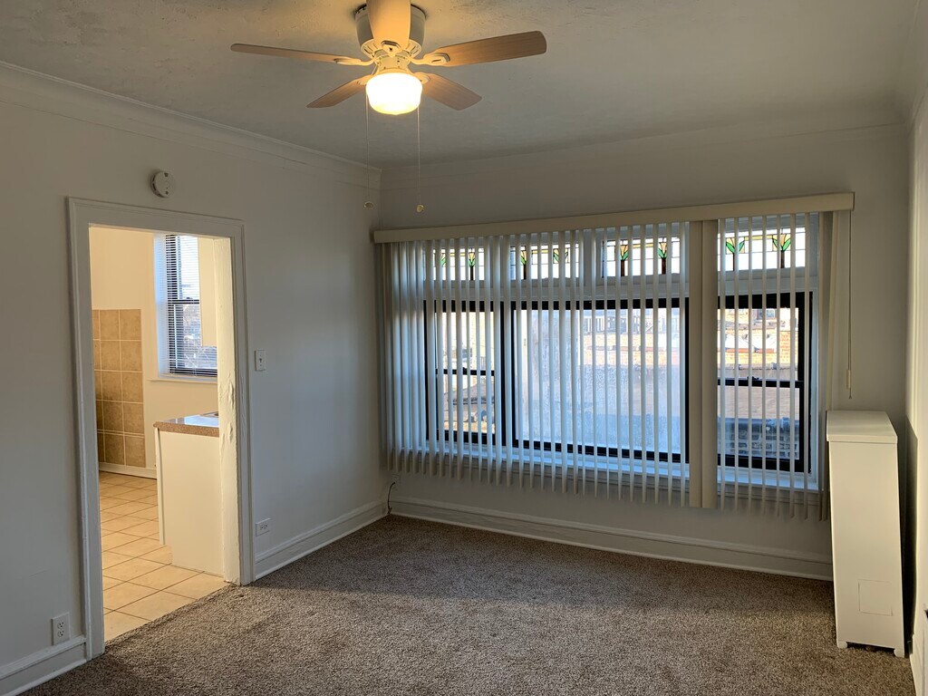 Large 1 bedroom, 1 bath apartment in a quiet building on a quiet block. Freshly painted; new carpet and appliances. In unit storage. Coin operated washer and dryer on-site. Close proximity to transportation and shopping. Property Manager on-site often.