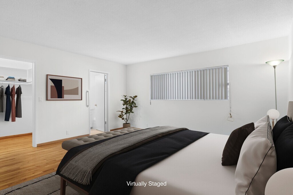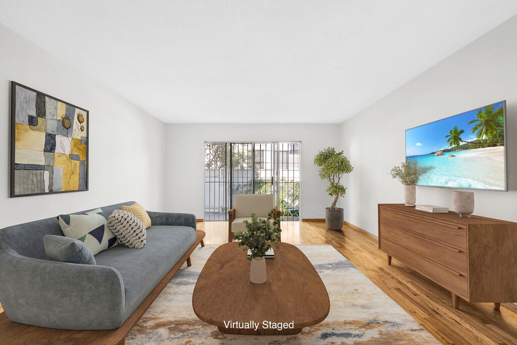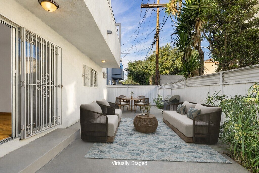 Spacious, beautifully maintained 3 bedroom residence just a half block from Beverly Hills. Tucked inside a charming four-unit Mid-Century building surrounded by lush foliage and thoughtfully placed potted plants, this single level home offers privacy and character in an outstanding location. Freshly painted and filled with natural light, the spacious floor plan features gleaming hardwood floors throughout. The oversized living room flows seamlessly to a shared patio, creating an inviting indoor-outdoor feel ideal for relaxing or entertaining. The bright, front-facing kitchen is both stylish and functional, offering a gas cooktop, granite countertops and backsplash, newer cabinetry, and abundant storage. The kitchen opens to a generous dining area perfect for hosting dinners or casual gatherings. The primary suite features a walk-in closet and an en-suite bathroom, while two additional bedrooms share a well-appointed hall bath, providing flexible space for guests, family, or a home office. Two car parking and shared coin-laundry room on site. A rare opportunity to lease in a boutique Mid-Century building just moments from world-class dining, shopping, La Cienega Park, houses of worship, and everything Beverly Hills has to offer!