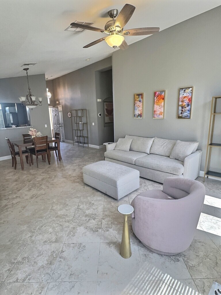 *FURNISHED* GORGEOUS home in The Pueblo, a North Summerlin community. This fully furnished three bed, two bath house is perfect for working professionals. One bedroom has been converted to an office space. The back patio was recently expanded and includes a seating area and grill. Pets are welcome, and the backyard provides ample room for animals. The two car garage has built in storage. The neighborhood is quiet and family friendly, adjacent to Pueblo Park and close to two primary schools. Enjoy easy access to shops and restaurants, including Boca Park, Downtown Summerlin, and Trader Joe's. Tenants are able to join the North Summerlin HOA as members. Owner pays water, sewage, trash. Tenant pays for wifi/cable, electric, gas. MUST SEE IN PERSON!