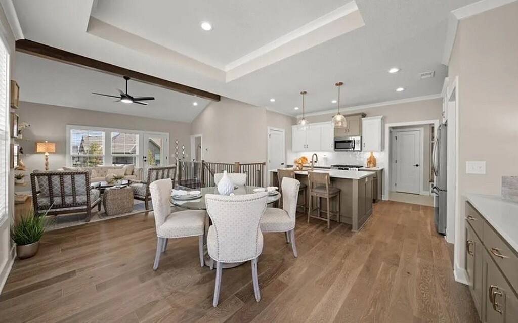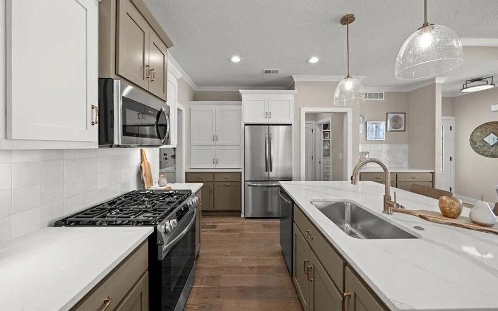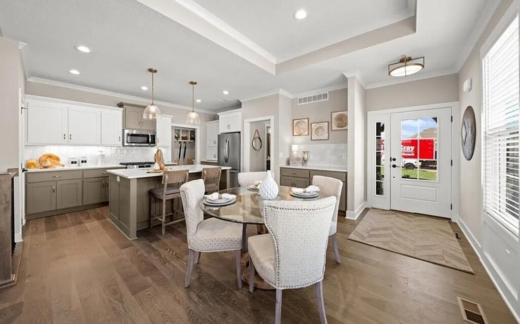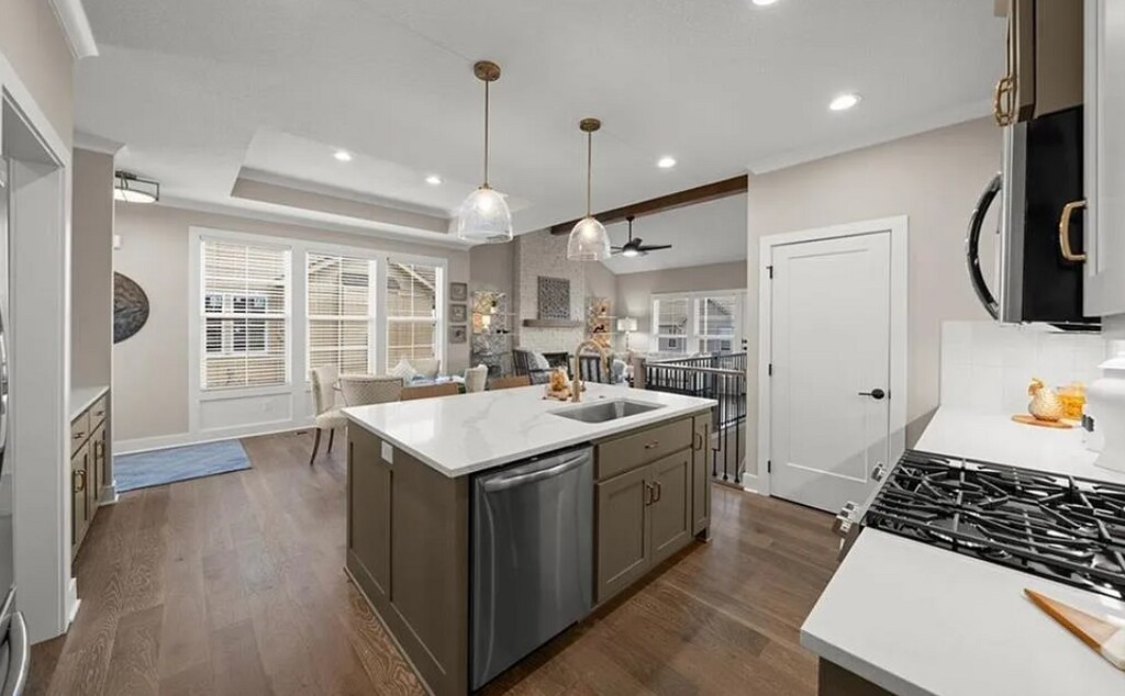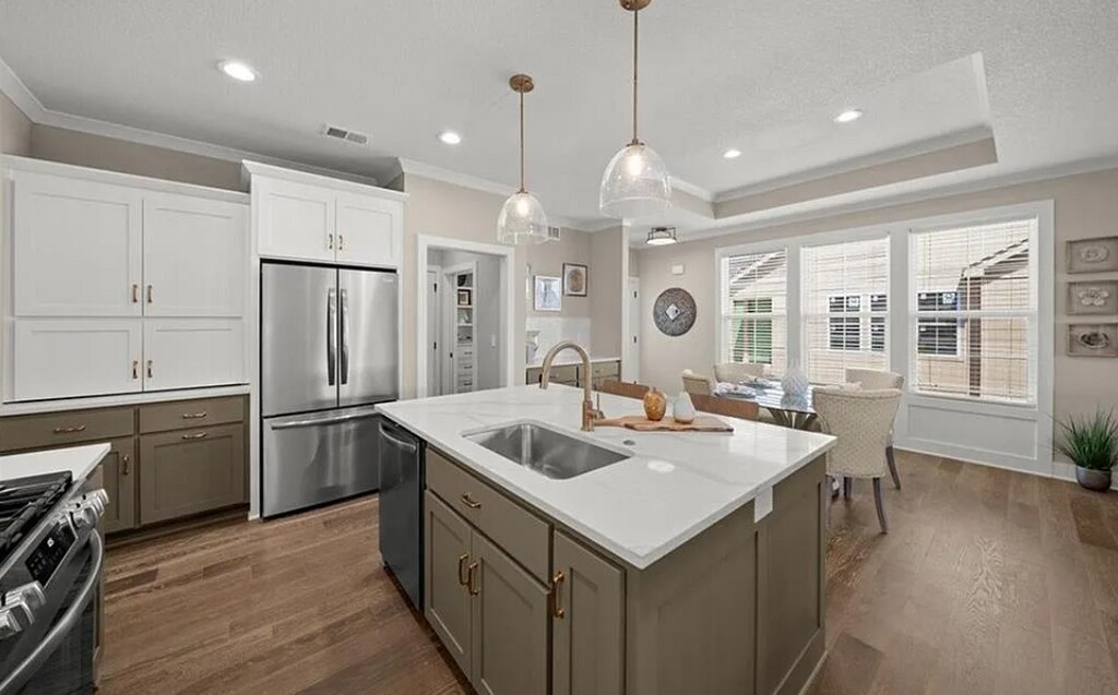 Move-in ready luxury villa in Bristol Highlands! This spacious Newport Reverse home offers 3 bedrooms and 3 bathrooms with an open-concept design, featuring a vaulted and beamed great room with fireplace and large windows leading to a covered deck. The gourmet kitchen boasts quartz countertops, a large island, pantry, soft-close drawers, stainless steel appliances, and a gas cooktop. The primary suite includes a vaulted ceiling, double vanity, tiled shower, and walk-in closet with convenient laundry access. The finished lower level provides two additional bedrooms, a full bath, and a generous rec room with walk-out access. Additional highlights include a 2-car garage with opener and keypad, energy-efficient furnace and A/C, full-yard irrigation system, and stylish tile finishes in all bathrooms. Ideally located near highway access, Lenexa City Center, Lake Lenexa, Shawnee Mission Park, restaurants, and award-winning DeSoto schools. Minimum 650 credit score required. No pets. *Pictures are from the model, floorplan is the same but actual finishes may vary