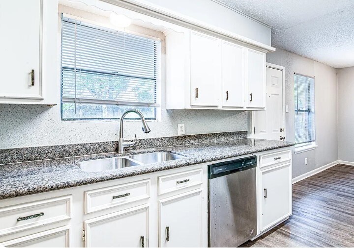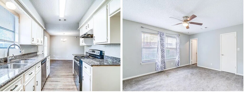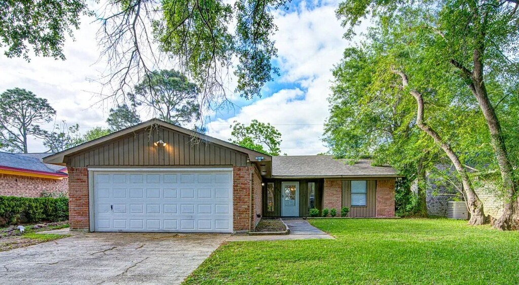 Welcome home to this beautifully maintained 3-bedroom, 2-bath gem in Angleton! Nestled among mature, shade-providing trees, this home offers a spacious split floorplan with a large primary suite featuring an en-suite bath and oversized walk-in closet. Enjoy two remodeled bathrooms, an open-concept living and dining area, and a galley-style kitchen complete with granite countertops, stainless steel appliances, and abundant cabinet space. The large living area is perfect for relaxing or entertaining. Additional highlights include carpet and vinyl flooring throughout, ceiling fans in every room, and a 2-car garage. our family.
