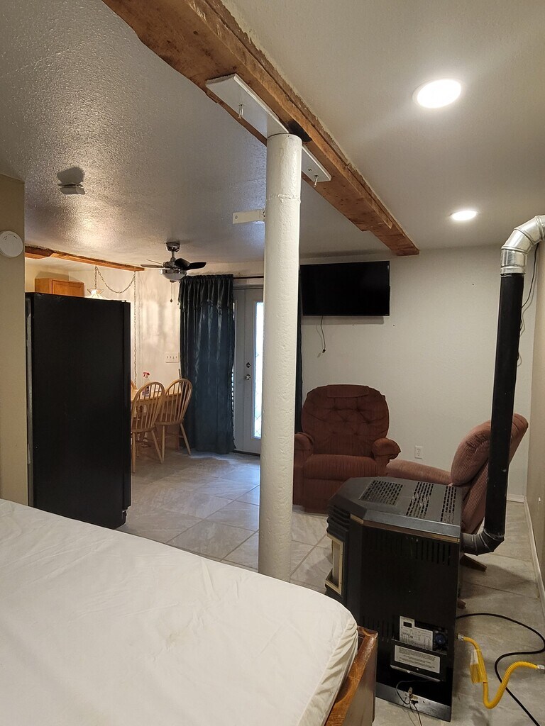 Super warm and cozy. Furnishings include high step-up over tub, high water bed type bed frame with 6 under drawers. Memory foam covered mattress, four chair kitchen table, wall mounted 32 inch TV with remote and ROKU, internet, trash, parking, electricity, gas, water. No pets, no smoking, no drugs. A 4x4 is a must in winter time. Rent is $500, deposit is $500 and application fee/back ground is $50. Call now to get qualified. Thank you for looking.