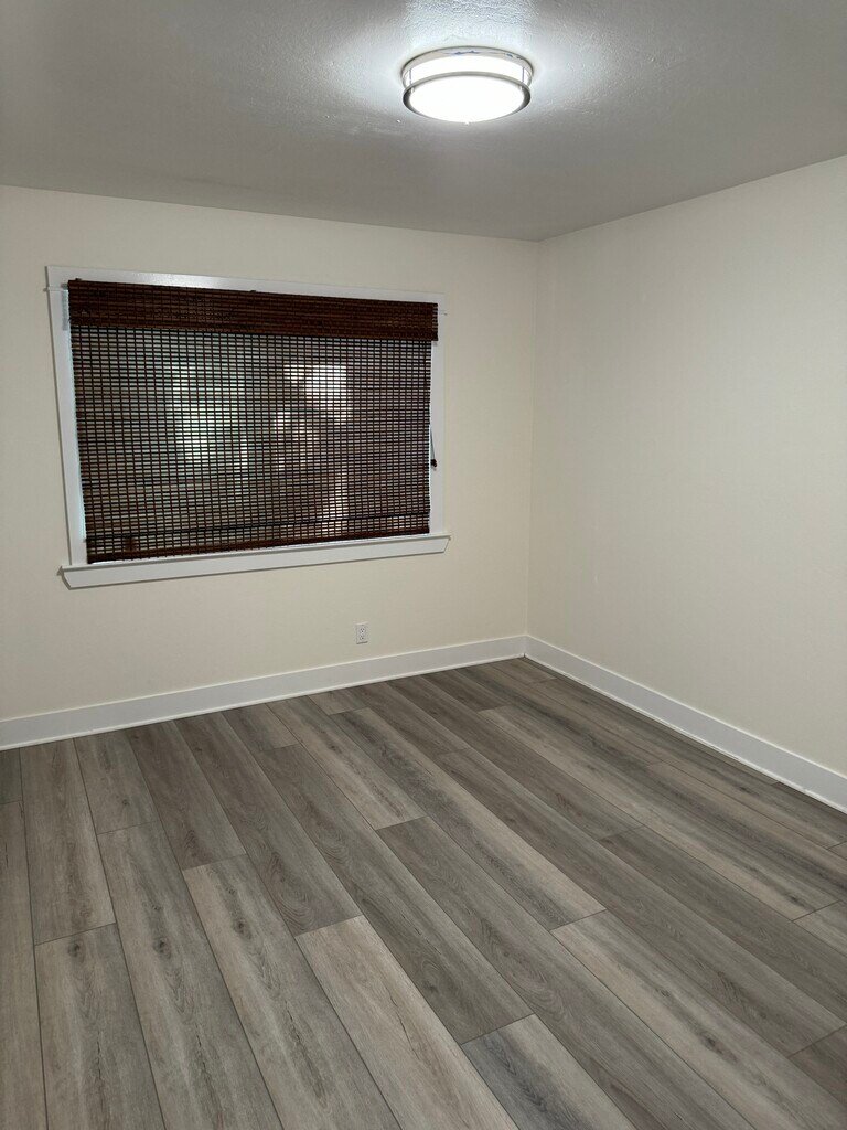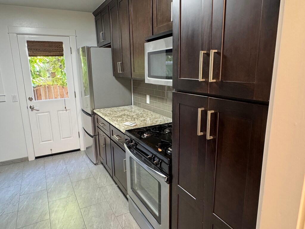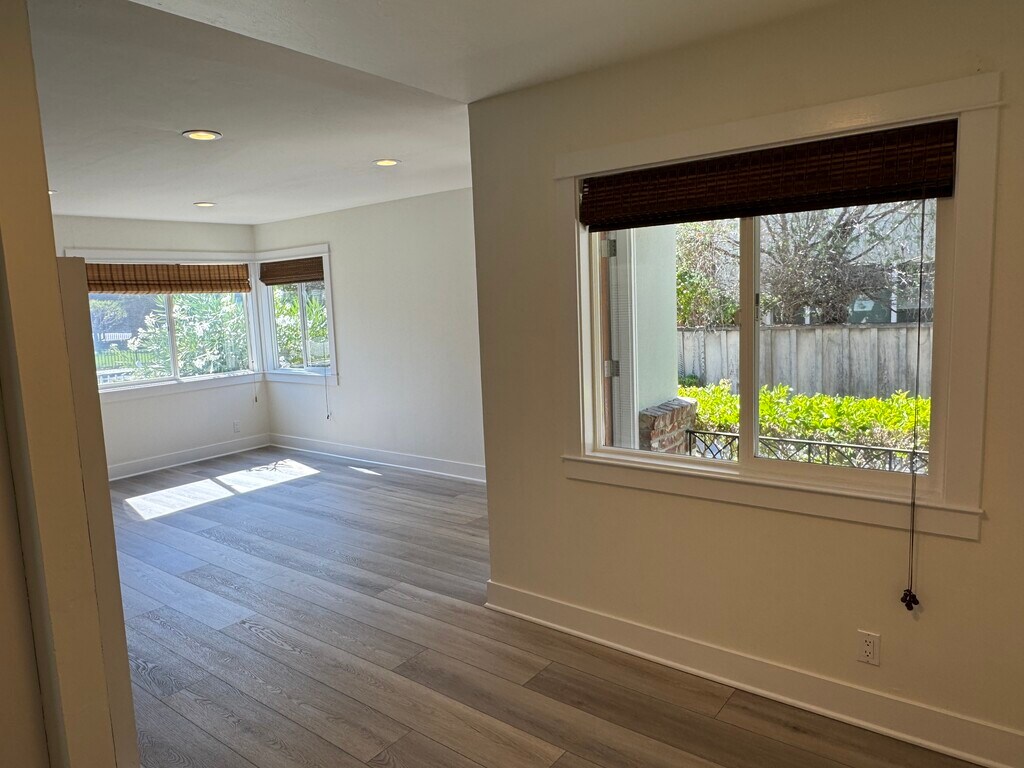 No pets and no smoking. 12-month lease. No application fee. Unit 1 is a prime, 750 sq. ft. spacious first floor renovated unit located in the heart of West Menlo Park close to Lyle park and the Stanford bike trail. Walking distance to exquisite stores and coffee shops of downtown Menlo Park. The building is superbly maintained. This unit has the following: Kitchen has ample cabinet space, granite counter tops with Italian tile backsplash, and all stainless-steel appliances (large refrigerator, self-cleaning new sealed gas burner range, over-the-range microwave, and dishwasher). The bathroom is equipped with a granite vanity top, tiled shower stall, and stainless-steel accessories. Freshly painted with new stone composite flooring. It receives a lot of natural light, and has designer bamboo window treatments with privacy liners. There are dimmable LED recessed lighting in the living room and kitchen areas. Additionally, the apartment has 2 large closets and 1 linen closet. Included is one covered garage parking place and large private storage for skis, suitcases, etc. Lastly, the common areas are regularly cleaned by a cleaning service, and the grounds regularly maintained by a gardening service. No pets and no smoking. 12-month lease. No application fee. Owner pays water. Tenant pays apartment's gas and electric, full-service trash for $30/mo. which includes pick-up and return of the various bins to the street, and $35 per month for unlimited laundry room commercial washer and dryer. 838 Fremont Street, Menlo Park, CA.