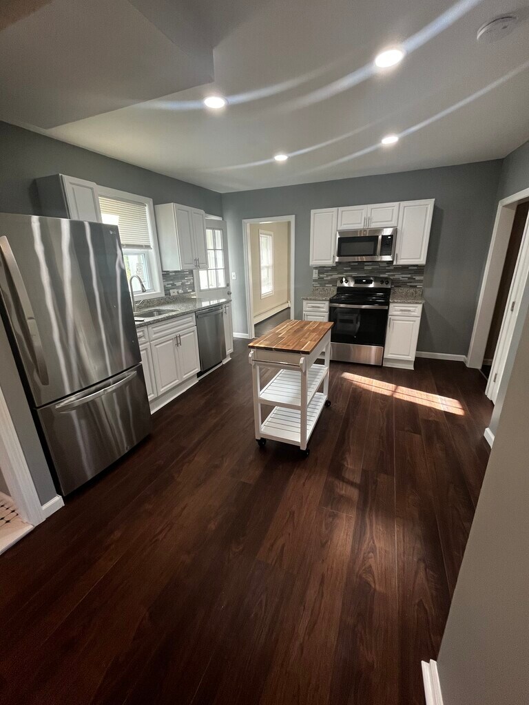 Welcome to this beautifully renovated two-story, four-bedroom, two-bathroom apartment in a sought-after location. Seize the opportunity to be the first resident of this stunning home, conveniently situated minutes from public transportation, major highways, restaurants, and shopping centers. This elegant and sunlit home offers a spacious open layout with upgraded finishes and modern appliances. The first floor features a large bedroom, a well-appointed kitchen, a comfortable living room, a full bathroom, a dining area, and a hallway. The second floor includes three generously sized bedrooms, another full bathroom, and a laundry room with washer and dryer hookups. Pets negotiable.