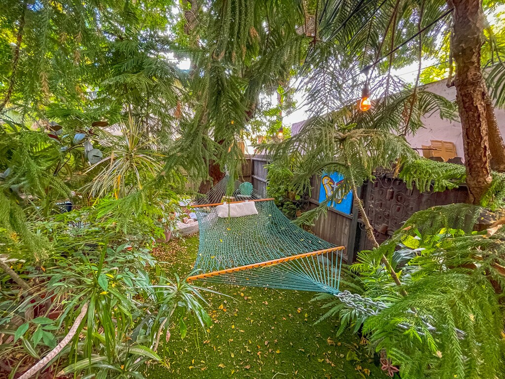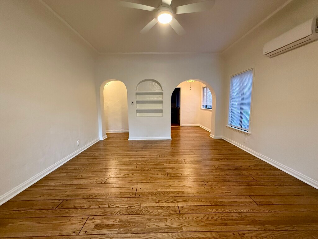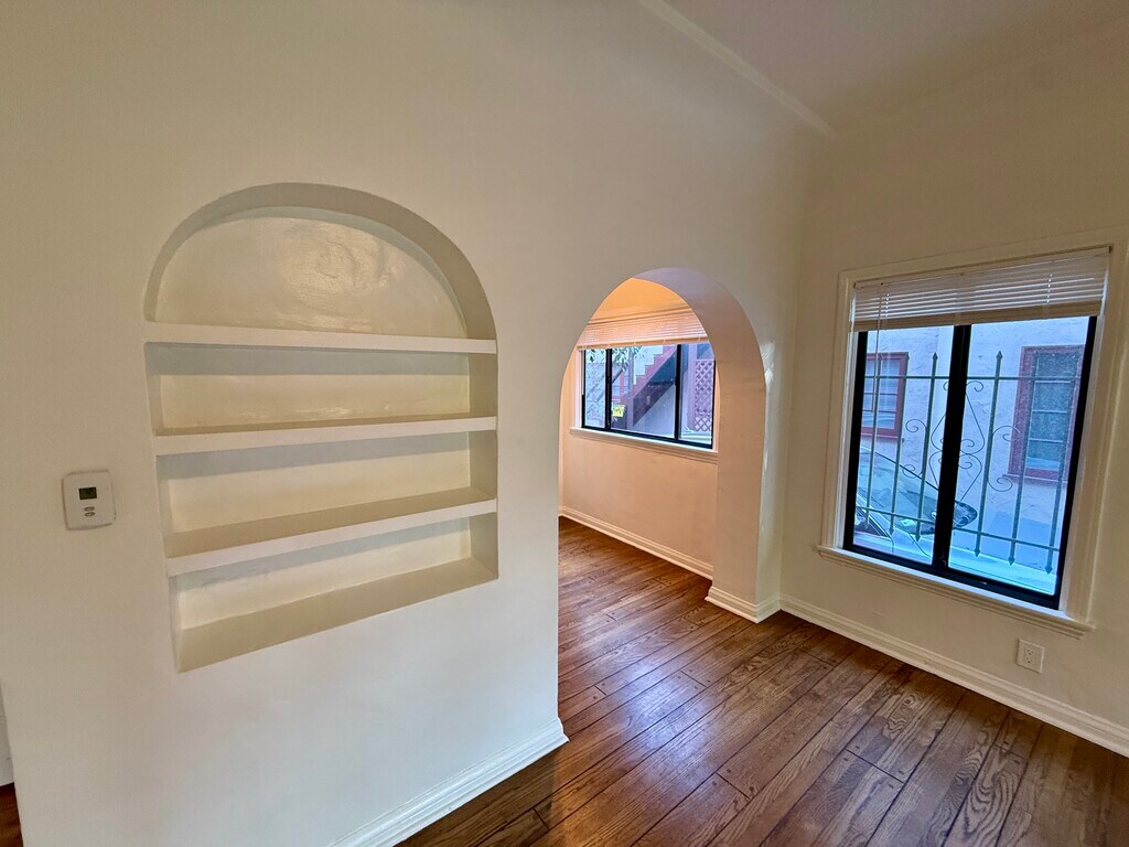 Quaintly situated in West Hollywood's vibrant Tri-West neighborhood, this Spanish Revival residence blends original charm and pride of ownership with modern updates throughout. Boasting two bedrooms, one updated kitchen and bath, ample storage, and over 1,000 sq ft, the home offers a rare combination of character and refinement. The kitchen features new quartz countertops, a new sink, stainless-steel appliances including a refrigerator with water filter and ice maker, dishwasher, LG washer and dryer, gas stovetop, generous cabinetry and storage, undermount lighting, and stainless-steel shelving. The hallway and bedrooms offer new luxury vinyl plank flooring, while the living room retains its original hardwood. Three split A/C units provide zoned comfort in the living room and bedrooms. The bathroom includes a quartz vanity, new light fixtures, and custom-built shelving, while the hallway's vintage Old Hollywood lighting ties in seamlessly with the property's character. A lush shared backyard features a hammock, deck, outdoor patio furniture, infrared sauna, and private community space. ***Street parking only; two permit passes included for the first year of lease.*** The location offers some of the best walkability in the city -- steps from bars, restaurants, fitness clubs like John Reed, Erewhon, Trader Joe's, the Pacific Design Center, and the bustling Melrose and Santa Monica Boulevards. Find your quiet respite in the center of it all here at 840 Huntley Dr!