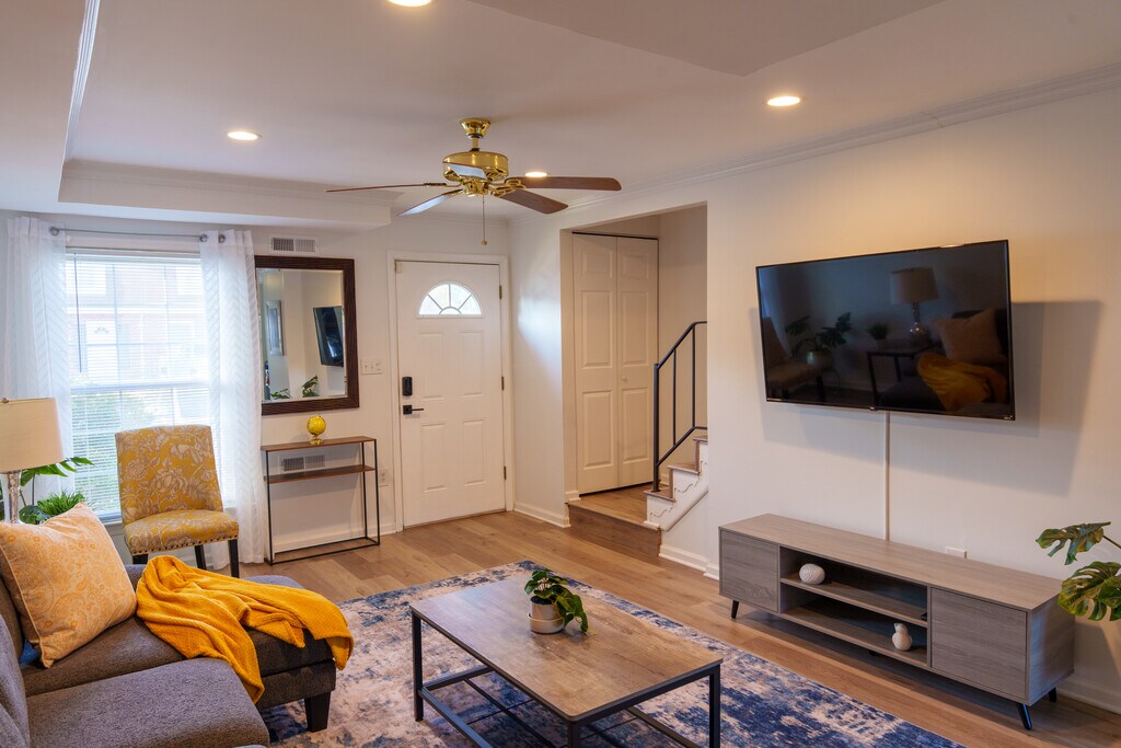 This fully furnished (and utilities and WiFi included) 3BR townhome in a residential community is calling your name! Located minutes away from Rt. 32, the Baltimore Washington Parkway, Arundel Mills Mall, Maryland Live! Casino, and nestled right between Baltimore and Washington, DC rests this family home with new floors, freshly painted walls, a private laundry room, spacious backyard, and a designated parking space. This home boasts a king, queen and full sized bed in three spacious bedrooms. Each bedroom has its own closet, and the primary bedroom has a large dresser for additional personal items. The second and third bedrooms are equipped with a queen and full size bed with storage drawers underneath. The third bedroom also has a small desk perfect for your laptop or desktop computer. The home is equipped with a full size washer, dryer, microwave, refrigerator, dishwasher, stove and oven. A storage area / pantry just behind the kitchen provides space for bulk items or additional food supplies. The fenced in backyard is equipped with a small two table and two chairs for having coffee or reading a good book at your leisure. Ring technology is used at this property, which tenants are welcome to have access to for the duration of their stay. Nestled right between Washington, DC and Baltimore, here are a few local gems you might want to check out: M&T Bank Stadium (Ravens) Camden Yards (Orioles) Nationals Park Northwest Stadium (Commanders) Downtown Annapolis Baltimore Inner Harbor National Aquarium National Harbor (Oxon Hill, MD) The Wharf (DC) Smithsonian museum and other attractions Arundel Mills shopping mall Maryland LIVE! Casino Horseshoe Casino This home provides the comfort you need after a long day of work (or the comfort you need to work from home all day!) Relax in the living room with a 55-inch flat screen TV, or cozy up in the king sized bed in the primary bedroom, with a 50-inch flat screen TV. This property is perfectly situated between Washington, DC and Baltimore, and also provides easy access to Annapolis. Neighboring towns include Fort Meade, Glen Burnie, Odenton, With gas heating and cooking, a spacious living room and a delightful eat in kitchen, all this home is missing is YOU! *Utilities and WiFi included in rent. *Income and credit check required. *Flexible lease options, 60-day minimum stay.
