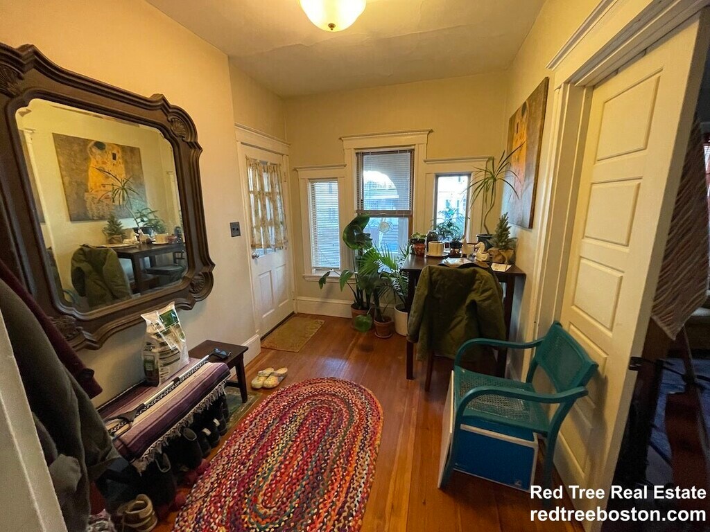 On a beautiful residential street near Davis Square. Spacious 6 room apartment on two levels. The first floor has a living room, dining room, large eat-in kitchen, 1 bedroom, and a bathroom. Upstairs there are two more bedrooms. The kitchen has a gas stove and a dishwasher. Wood floors. Newer windows. High ceilings and nice woodwork. Rear porch. Small shared yard. Laundry is free of charge in the basement. One to two tandem spots on the driveway, otherwise permit parking. New gas furnace.