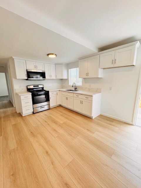 Just remodeled, Cozy 3 bedroom 2 bath home features single level. New remodeled kitchen with sleek quartz countertops and new cabinets. Brand new stove/oven and microwave. Brand new gorgeous vinyl plank flooring in living room and kitchen. New plush carpet in bedrooms. New paint through-out. Newer double pane windows. Nicely remodeled bathrooms. Air conditioning in bedrooms and living room. Enclosed front patio. Washer and dryer hook ups. Lots of parking with some storage. Landscaping included. Great neighborhood! Close to shopping, freeways. Available to move in Now. Please call for showing.