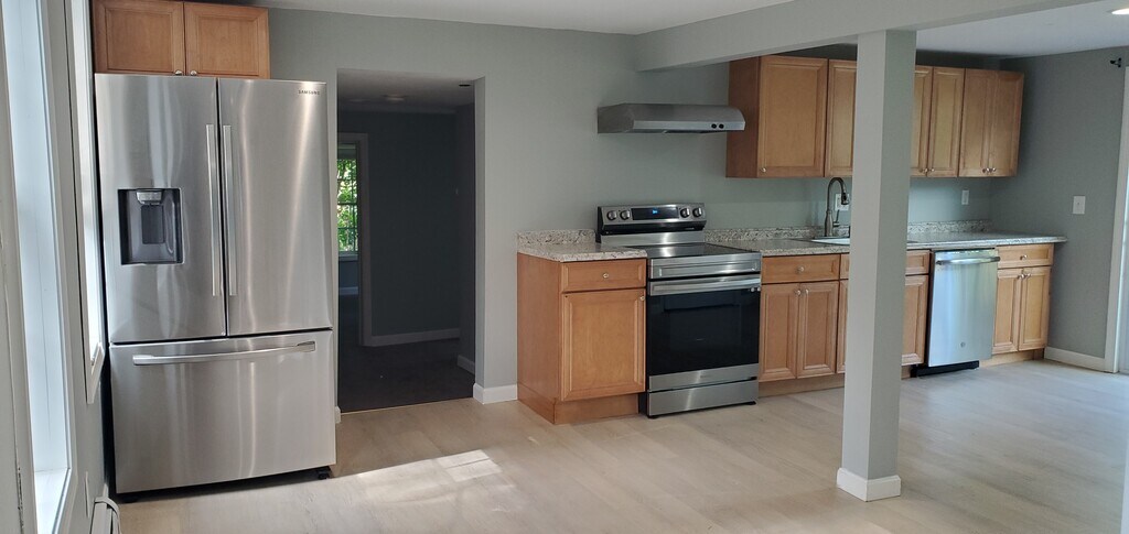Exeter 3 Bedroom 1.5 bath apartment 1st Floor Unit 1200+/- s.f. Recently renovated throughout. Gas heat. Stainless steel refrigerator, stove and dishwasher Laundry hook-ups, large shared yard, private deck Easy walk to downtown. Two off street parking spaces No dogs – cat possible No smoking (or vaping). Two adults, two children maximum. One year or more lease available. Security deposit required.