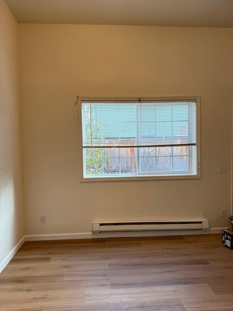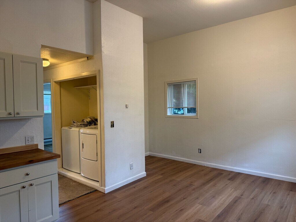 In a single story building with only three apartments, this two bedroom, one bathroom apartment is situated in the most private location of the building. Each apartment has a private outdoor area as well as a designated parking spot. A large communal space with mature trees is a perfect setting for family gatherings. There are windows in most of the rooms, several of which face beautiful green outdoor spaces. This apartment has a beautiful kitchen, tall ceilings, new laminate flooring and new washer and dryer.