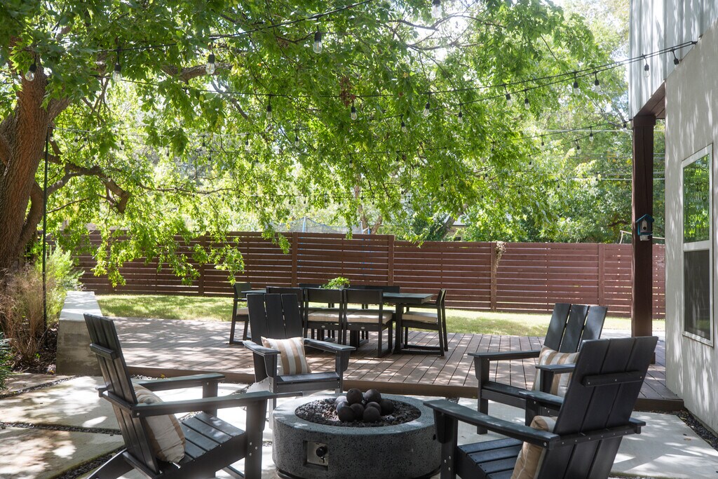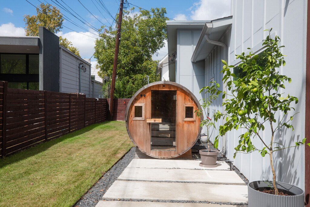 4BR/2.5BA single-family home that is a true private residence with no shared walls or A/B unit layout in the heart of 78704 on a cul-de-sac. The main level features polished concrete floors, a modern kitchen with stainless appliances and an island that opens directly to the main living area, and a dramatic atrium-style space with 20+ ft ceilings that fills the home with natural light. The first-floor primary suite opens directly to the remodeled backyard and includes dual shower heads, a large walk-in closet, and an additional closet for extra storage. Upstairs, hardwood floors lead to three more bedrooms that can flex for family, guests, or office space. Optional: Outdoor furniture to stay. Optional: At home garage gym equipment to stay. Additional features include two HVAC systems (independently controlling upstairs and downstairs), a dedicated laundry room, and a private two-car garage with extra storage plus driveway parking for up to five vehicles. The backyard has been fully upgraded with an extended deck, outdoor dining area, bistro lighting, new landscaping, a firepit lounge, and a custom 6-person redwood sauna. Minutes from South Congress, Zilker Park, and Downtown Austin.