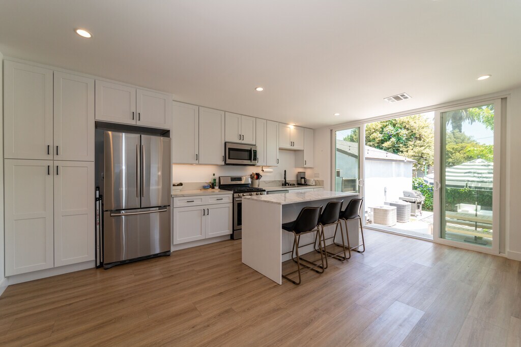 You can't beat this location--sitting on a quiet, tree-lined street, minutes away from downtown Culver City, a short distance to the Metro Station, the upcoming Culver Steps, and endless cafes and shops. This newly built back unit in a duplex features 3 bedrooms, 2bath lots of windows and super bright. The unit has new floors, bathrooms, new central heath and air, washer and dryer in the uni, recess light through out. Kitchen features white granite counter tops and all new stainless steel appliances and an island. Living room opes to a private backyard with fire pit, BBQ and seating area. Beautiful hill top view from the living room.