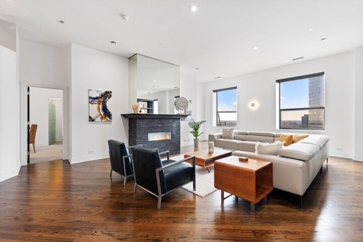 Huge 2800 Sq Ft 3 bedroom SW Penthouse on South Michigan Avenue. South Loop, Printers Row and The Loop are all steps from your door. Across the street to Grant Park, Maggie Daley Park, Millenium Park, The Art Institute and so much more.. Great location. You are greeted home by double doors and an extra wide foyer, which leads into a very open living room with a gas fireplace. The open concept dining space is separated by a beautifully built open shelving unit. Looking through the west facing windows from this top floor unit you get unobstructed views of the most beautiful sunsets and cityscape. If you like to cook, this kitchen is it. It includes a Wolf double oven, Bosch gas cooktop, Sub Zero Fridge, Bosch Dishwasher and an RO water filter. An island provides storage and seating. Additionally the attached walk-in pantry provides storage and includes the Thermador microwave, warming drawer and a wine fridge as well. The main bedroom is a suite, which includes a spacious room, sprawling walk-in closet, private bath with separate shower/jacuzzi tub and has access to a balcony. The 2nd bedroom has an abundance of space, 2 closets, its own balcony and has direct access to the 2nd bath, which additionally has a separate shower/whirlpool tub. The 3rd bedroom/den includes a wall of built-ins and enough room for an office or out of town guests. There is a bonus laundry room which includes a second fridge, a wash sink and additional storage. The building also includes an exercise room, business center/library, Amazon hub locker, 24 hour door staff, onsite management and maintenance. Pet friendly, certain fees apply. Located in the South Loop school district. Reach out to schedule a private showing.