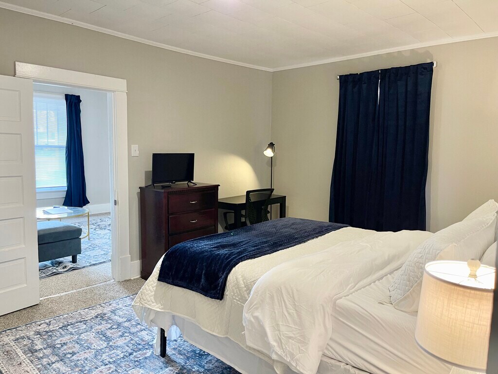 Beautifully Renovated 2BR Bungalow – Fully Furnished & Near Downtown Florence Enjoy comfort and charm in this meticulously renovated 1940s bungalow located just minutes from downtown Florence and the Shoals area. This fully furnished home features two spacious bedrooms, each with a queen bed, dresser, blackout curtains, and ample closet space. The bathroom includes a full shower/tub combination, offering a relaxing retreat. The large living room provides a cozy place to unwind with a plush sofa and a big-screen TV, while the dining area comfortably seats four. The kitchen comes fully equipped with cookware, dishes, and modern appliances—ready for easy home-cooked meals. Additional conveniences include a full-sized washer and dryer, central heating and cooling, and a fenced backyard perfect for relaxing outdoors. This home comfortably sleeps four and provides everything needed for a stress-free extended stay.