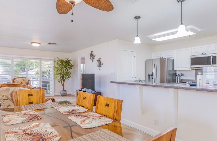 Experience the magic of Ko Olina, "a place of joy" as it translates from Hawaiian. 20 miles from Honolulu on Oahu's leeward coast, Ko Olina is an exclusive destination for both locals and travelers. Relax in your comfortable, furnished condo located within the gated community of Ko Olina Kai Golf Estate. This 3BR/2BA upstairs unit sleeps up to 6 people and is perfect for families or groups of friends both long- and short-term. Blending comfort and luxury, an open floor plan with tropical decor invites you into your island getaway. A full kitchen is equipped with stainless steel appliances and great counter space. A coffee bar, breakfast bar, and dining table provide options for preparing both casual eats and drinks or sophisticated meals. The master bedroom features a king bed, flat-screen TV, ample storage, and ensuite bathroom with a vanity and shower. The other bedrooms are both furnished with queen beds, TVs, and a shared bathroom. Your private lanai is surrounded by tropical flowers and plants; sip your coffee or wine and relax in the cool island trade winds. The picturesque, 34-acre Ko Olina Kai Estate offers cabanas, barbeque areas, a pool, and spa. Within walking distance are Ko Olina's famous lagoons with easy beach access. These calm, protected waterways are perfect for swimming, snorkeling, paddleboarding, and kayaking. Plenty of cafes, eateries, and shops in the community provide everything you need for your stay of any length. As a community resident, you have access to a Ko Olina Sports Club membership which includes discounts at shops and restaurants, classes, and a gym. With a direct exit into Ko Olina off the H1, commuting is simplified. Escape the grind of Honolulu while being close enough to experience the city lights at your convenience. Immerse yourself in the natural beauty of the west side; hike the Maili Pillbox in Nanakuli, dig into Hawaiian history in Kapolei at Barber's Point Lighthouse or holoholo at Paradise Cove... (Ask us about the Mermaid Cave!) Soak up the Pacific sun and bask in the turquoise waters; stay for one month or one year and experience the aloha of Ko Olina for yourself... just bring your bags! Rates: $5500 (+taxes/fees) per month if lease is 6 months or more; $6500 (+taxes/fees) per month if lease is less than 6 months; $7500 (+taxes/fees) per month for holiday rates (December/January/February 2025). Please note... Per Hawaii zoning laws, this unit mandates a 30-day minimum booking. Leases less than 6 months are subject to GET/TAT tax of 17.92%. 2 parking stalls provide space for compact and standard vehicles. This unit cannot accommodate large-sized SUVs and oversized vehicles. This unit and its entire premises are non-smoking; failure to comply with this policy may lead to eviction without refund. In compliance with Honolulu Fire Code, there is no BBQ/grilling allowed on the lanai; please utilize one of the many grills provided by the estate. A hui hou a malama!